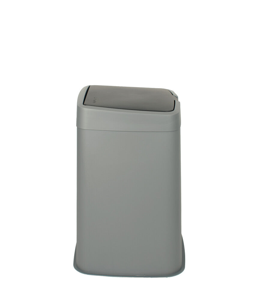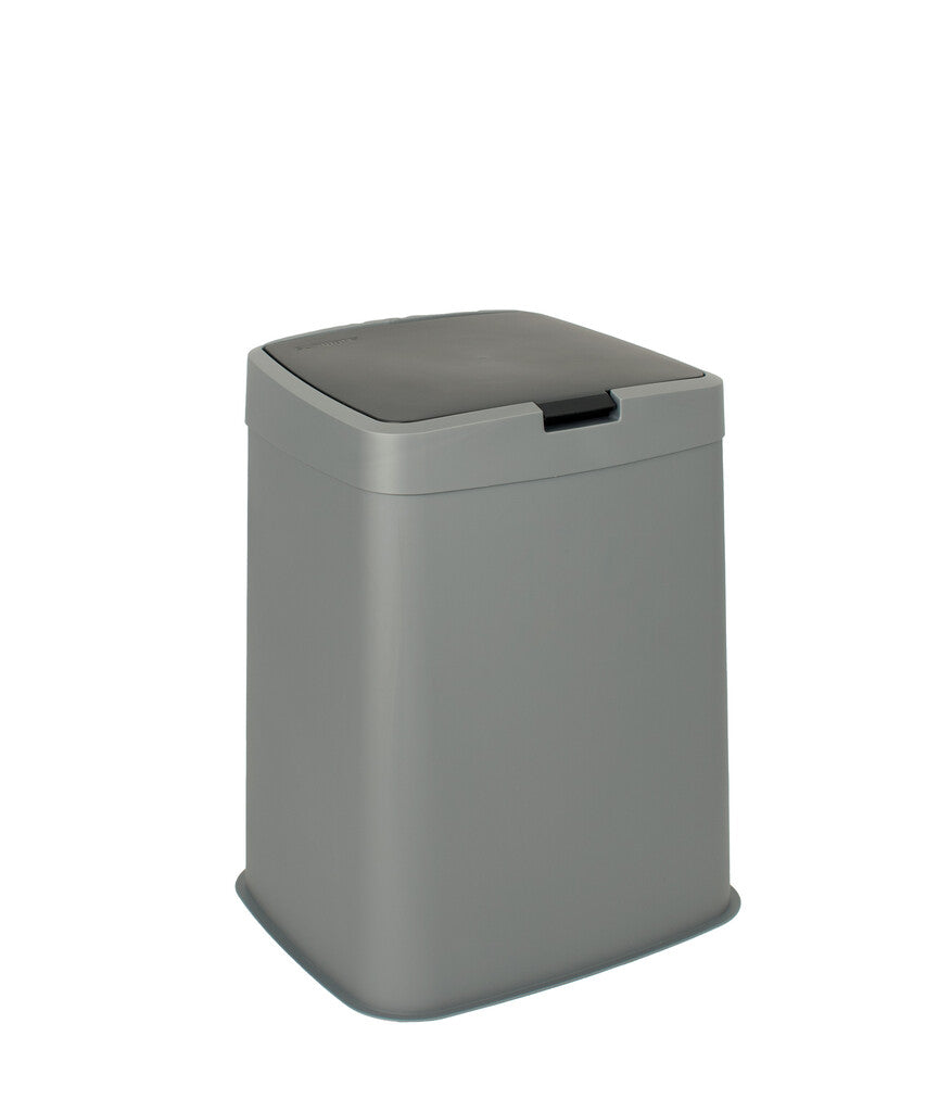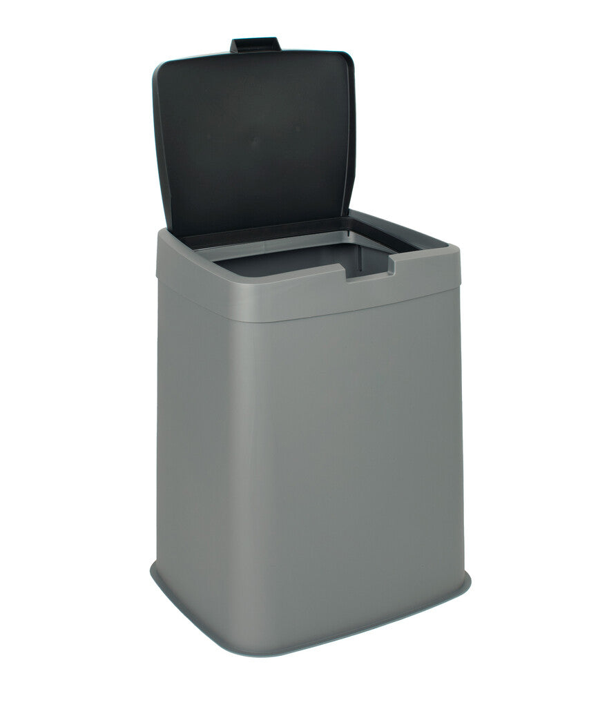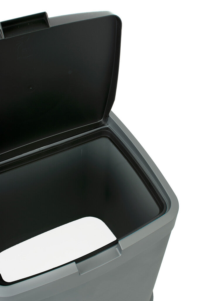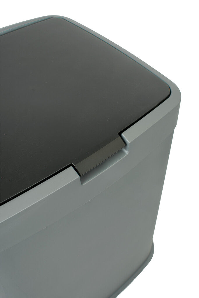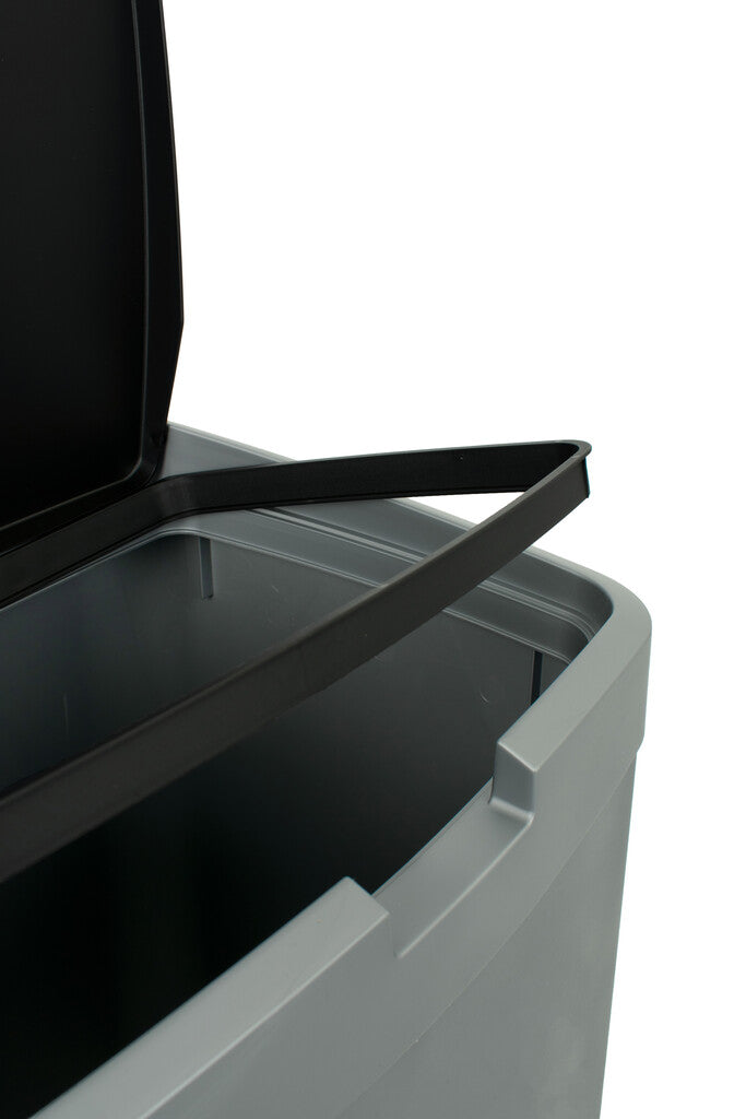 Kunststof afvalbak met losse top en donker gekleurd deksel.