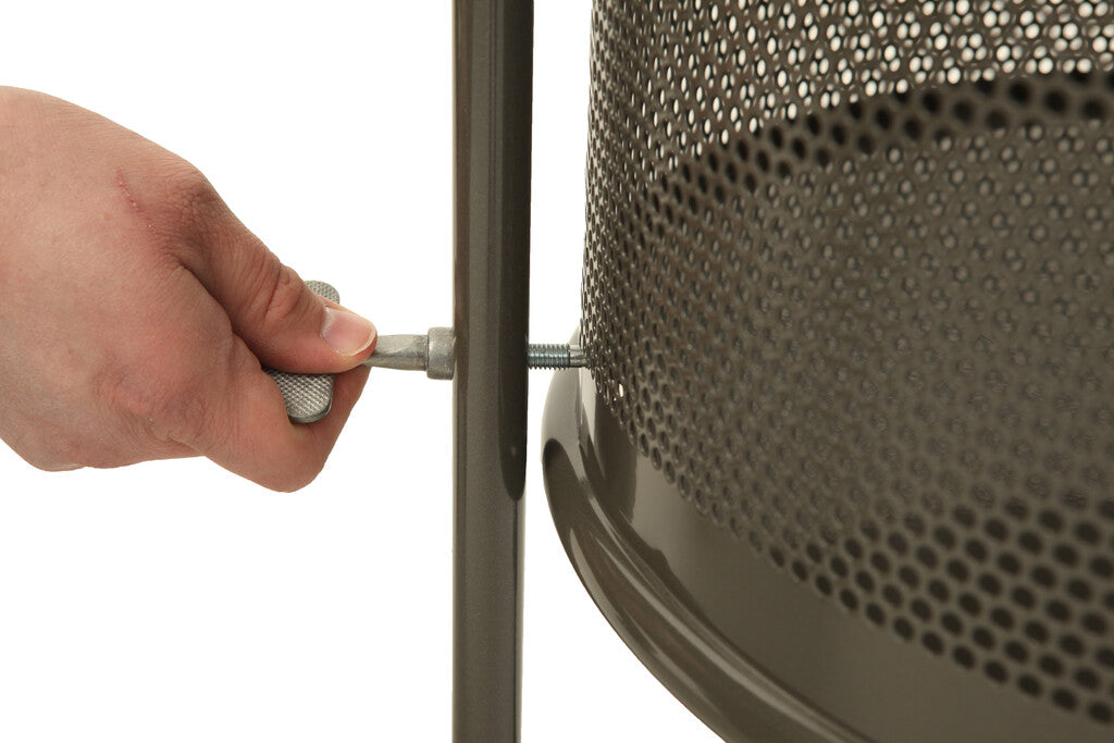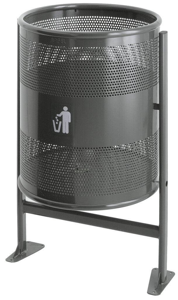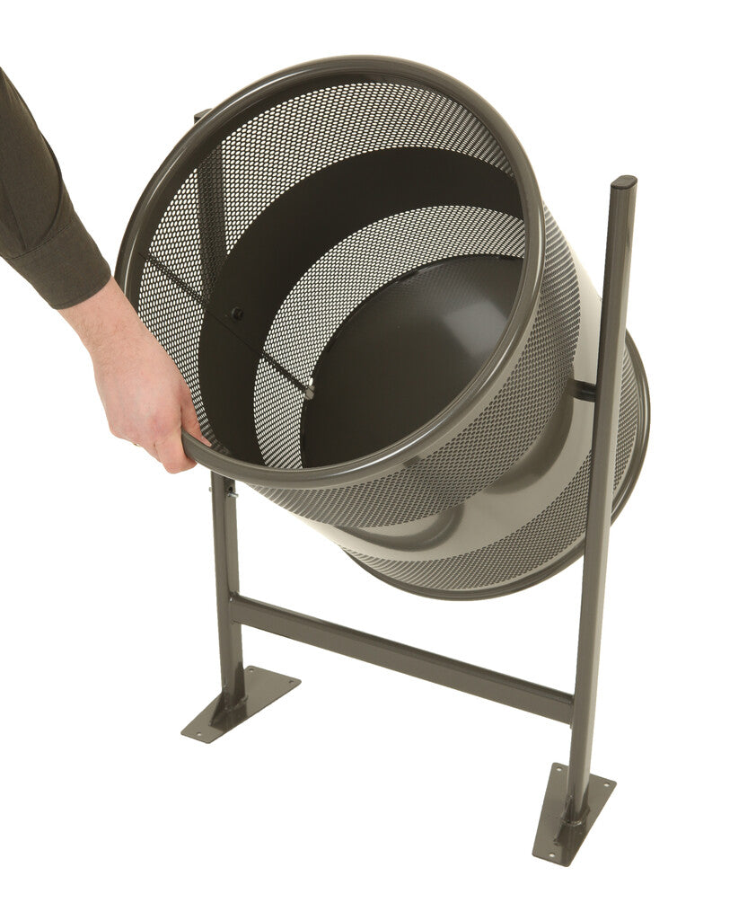 Ronde, gedeeltelijk geperforeerde afvalbak van metaal op statief. De bak kan geleegd worden door het losdraaien van de sluitschroef, de bak is dan kantelbaar.