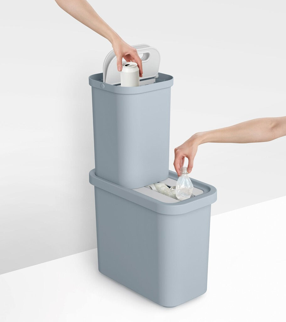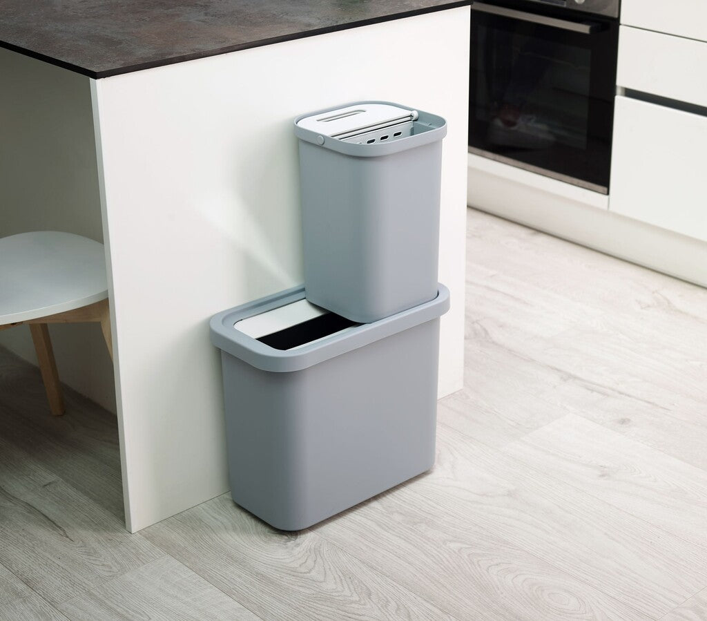Functionele, stijlvolle afvalbakkenset bestaande uit 1 afvalbak met groot compartiment van 32 ltr en 1 afvalbak van 2x7 ltr. In de inwerpopening van de 32 ltr afvalbak zitten twee speciale valkleppen die het afval pletten. Hierdoor wordt het afval in de afvalbak gedrukt en kan het afval niet uit de inwerpopening steken. Dankzij de overlappende rand van de deksel is de (eventuele) afvalzak netjes uit het zicht. De compacte afvalbak van 2x7 ltr heeft 2 compartimenten voor het scheiden van afval en de deksel bestaat uit twee hefkleppen waardoor het afval afgeschermd wordt. Daarnaast kan de deksel als handvat worden gebruikt, hierdoor is de afvalbak makkelijk te verplaatsen.