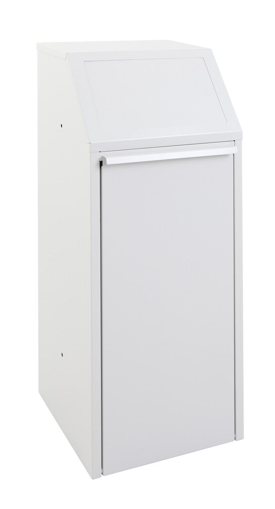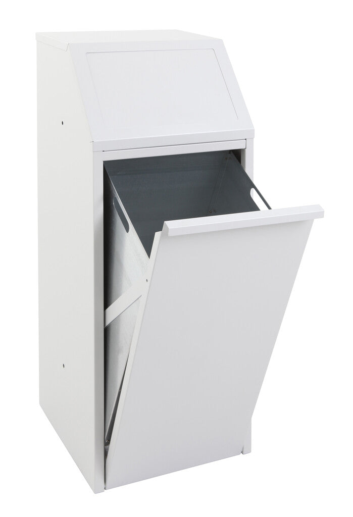 Metalen afvalverzamelaar met pushdeksel. Voorzien van een metalen binnenemmer (33x35x57 cm), die door het naar voren trekken van de voorzijde van de afvalbak eenvoudig kan worden geleegd.