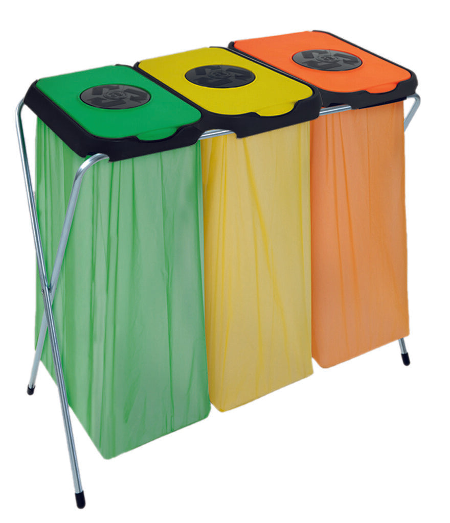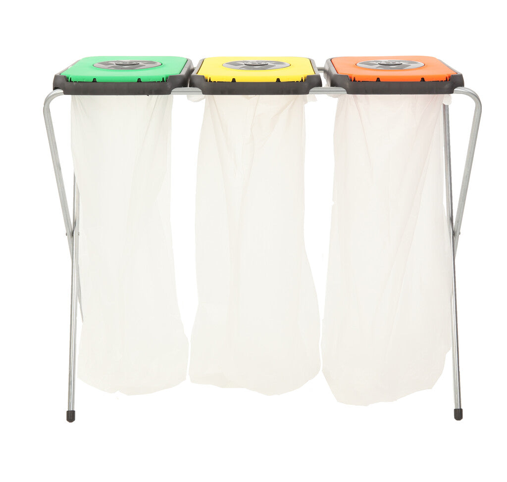 Trio opklapbare afvalzakhouder bestaande uit een gegalvaniseerd buizenframe en gekleurde kunststof deksels. In de klepdeksels zit een extra ronde inworpopening/ pushklep.