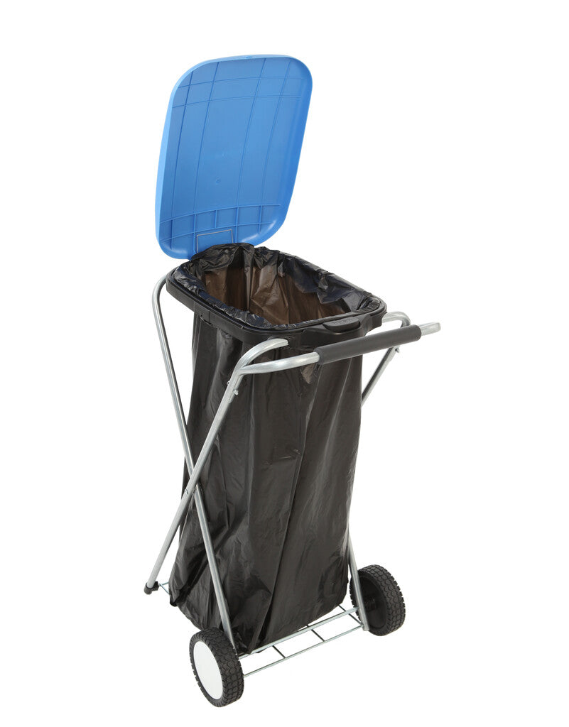Mobiele afvalzakhouder bestaande uit een gegalvaniseerd buizenframe en gekleurd kunststof deksel. De deksel opent eenvoudig door op de Push knop te klikken. Voorzien van twee polypropyleen wielen, maakt verplaatsen makkelijk. Met kunststof afvalzakhouderring onder het deksel en metalen bodemrooster dat er voor zorgt dat de afvalzak netjes op zijn plaats blijft bij het verrijden.
