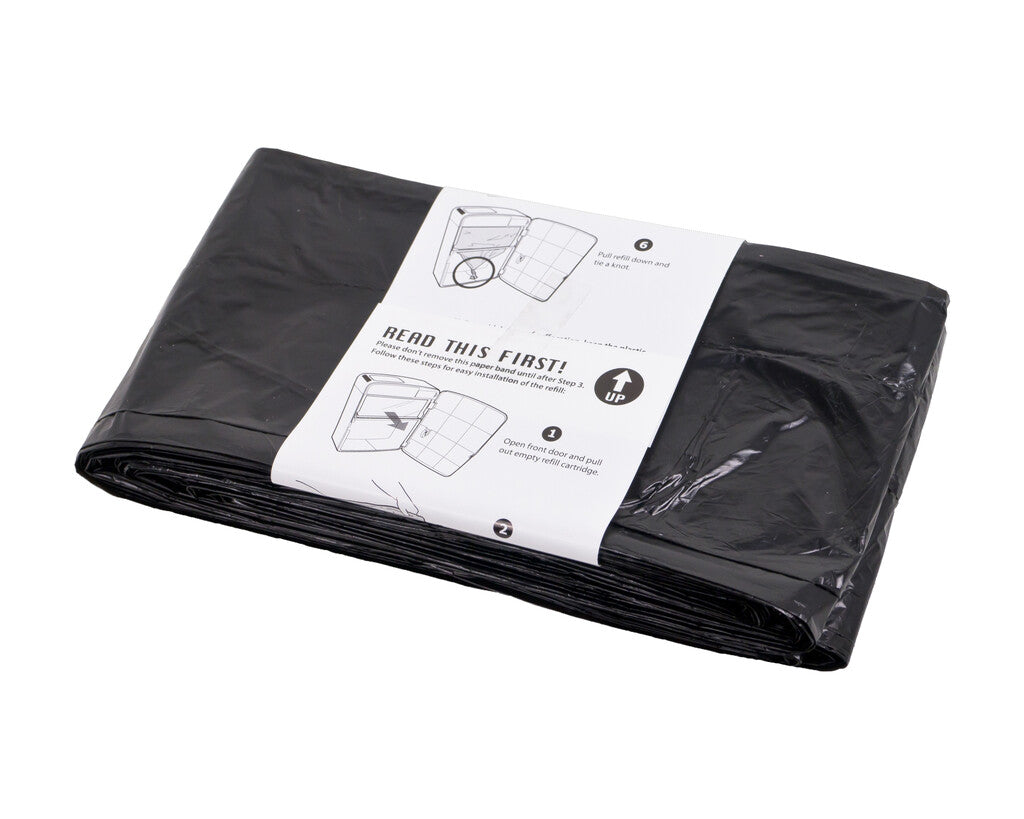 Uniek oneindig afvalzaksysteem. Wanneer de onderzijde is afgeknoopt, wordt er een nieuwe zak gevormd. Hierdoor is het wisselen van de afvalzak zeer efficiënt en eenvoudig. De afvalzakken zijn gemaakt van 20 procent gerecycled materiaal en zijn biologisch afbreekbaar, sterk, flexibel en geurbestendig. Tot 20 ledigingen per pak.