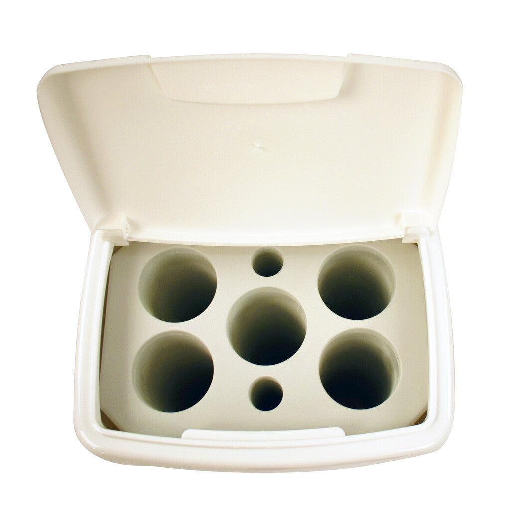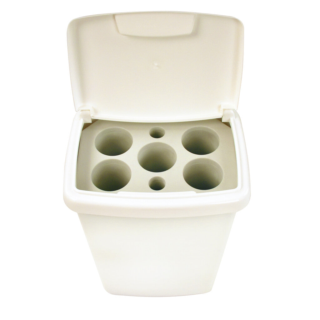 Kunststof afvalbak met vlak deksel voorzien van ABS kunststof bekerinzet. Door het efficiënte stapelsysteem passen er meer bekers in de bekerbak. De inzet bevat 5 gaten/ buizen met een doorsnede van 82 mm voor het inzamelen van bekers en 2 gaten/ buizen van 35 mm doorsnede voor roerstaafjes. De inzet is netjes afgewerkt zonder scherpe randen, waardoor eenvoudig te legen en schoon te maken.