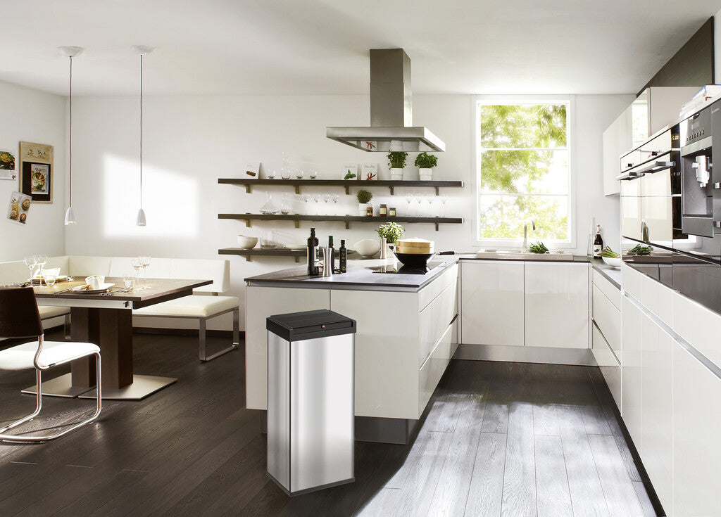 Rechthoekige afvalbak van RVS met zelfsluitend, in tweeën gedeeld swingdeksel van kunststof. Met gepatenteerd afvalzak-klemframe. Vlak verpakt, maar snel in elkaar te zetten.