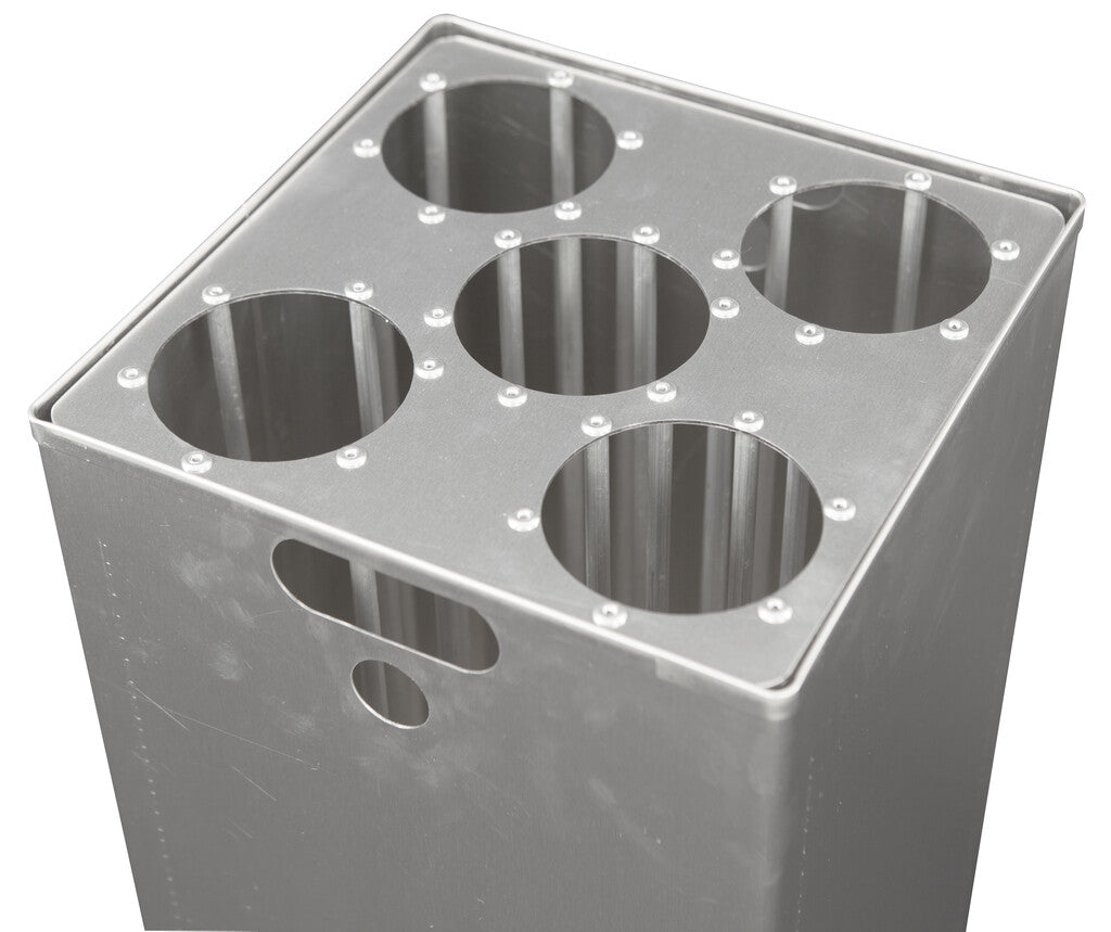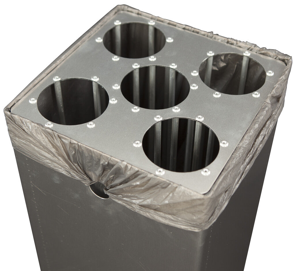 Binnenbak en inzet voor bekers met spijlen van hoogwaardig aluminium. Mooi afgewerkt zonder scherpe randen. De inzet is voorzien van 5 gaten met een diameter van 83 mm, gangbaar voor de meeste bekers. Door het efficiënte stapelsysteem passen er tot 3x meer bekers in. De binnenbak is voorzien van handgrepen die er tevens voor zorgen dat de afvalzak netjes op zijn plaats en uit het zicht blijft. Geschikt voor de Carro-Lift en Carro-Kick 55 liter.