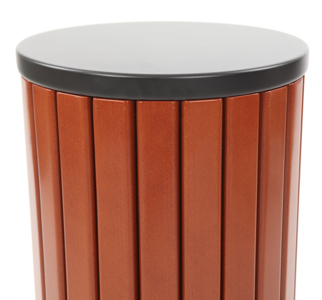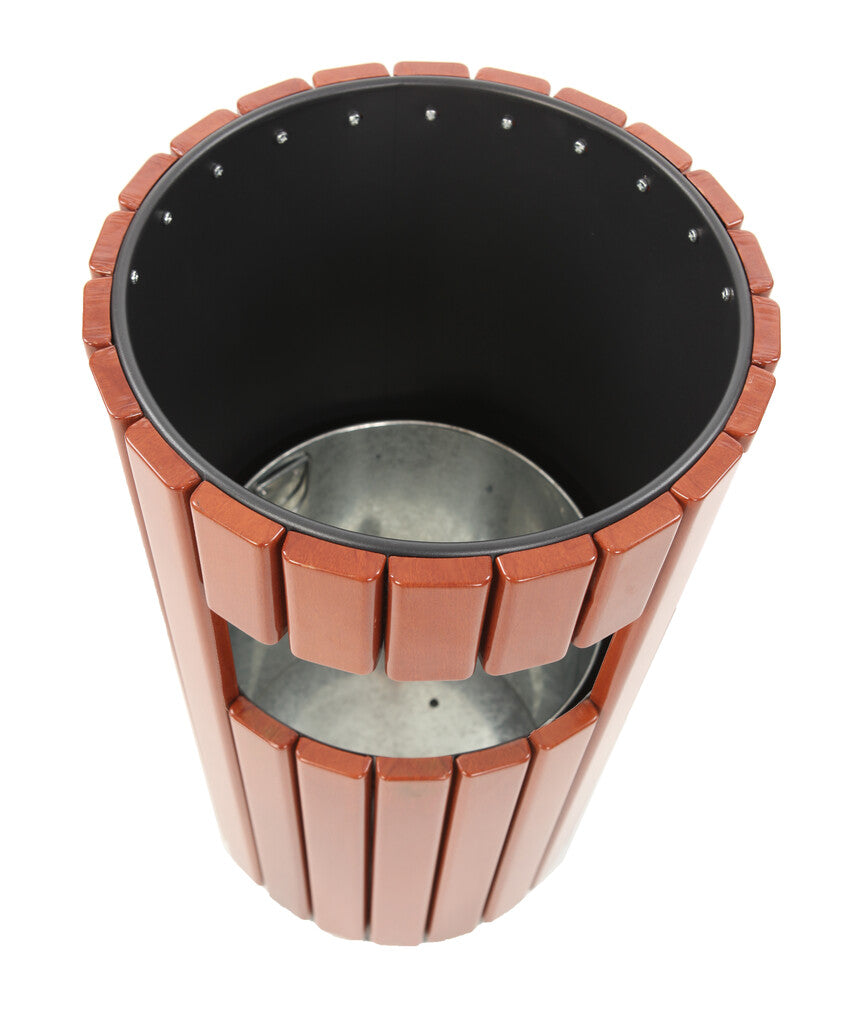 Ronde buitenbak bestaande uit een stalen frame met hout look. Voorzien van verzinkte binnenemmer en 1 inworpopening aan de zijkant (23 x 14 cm).