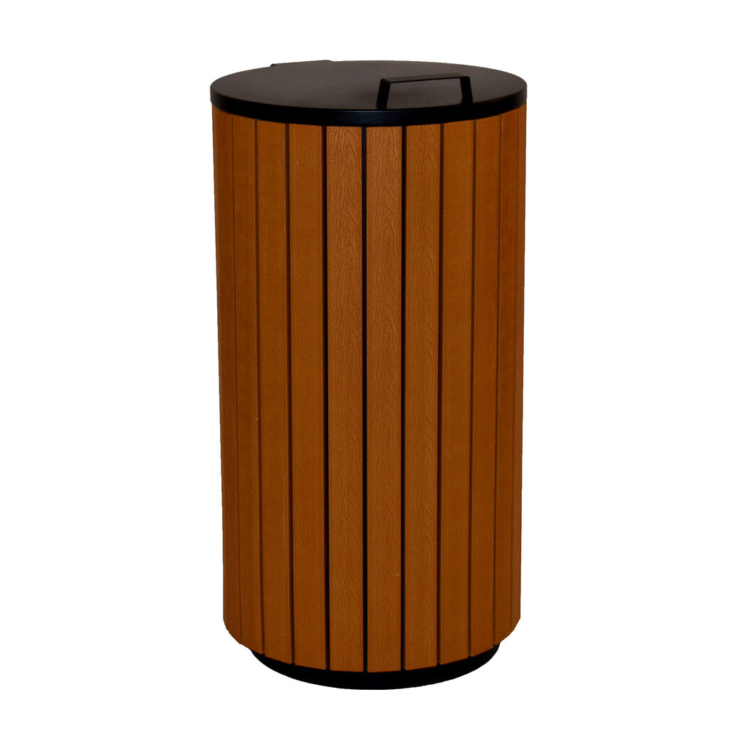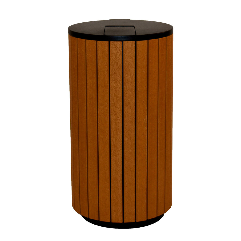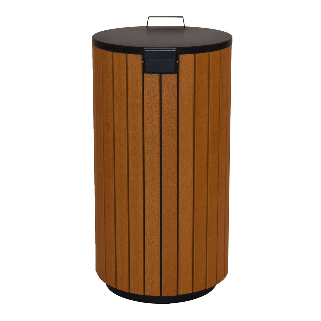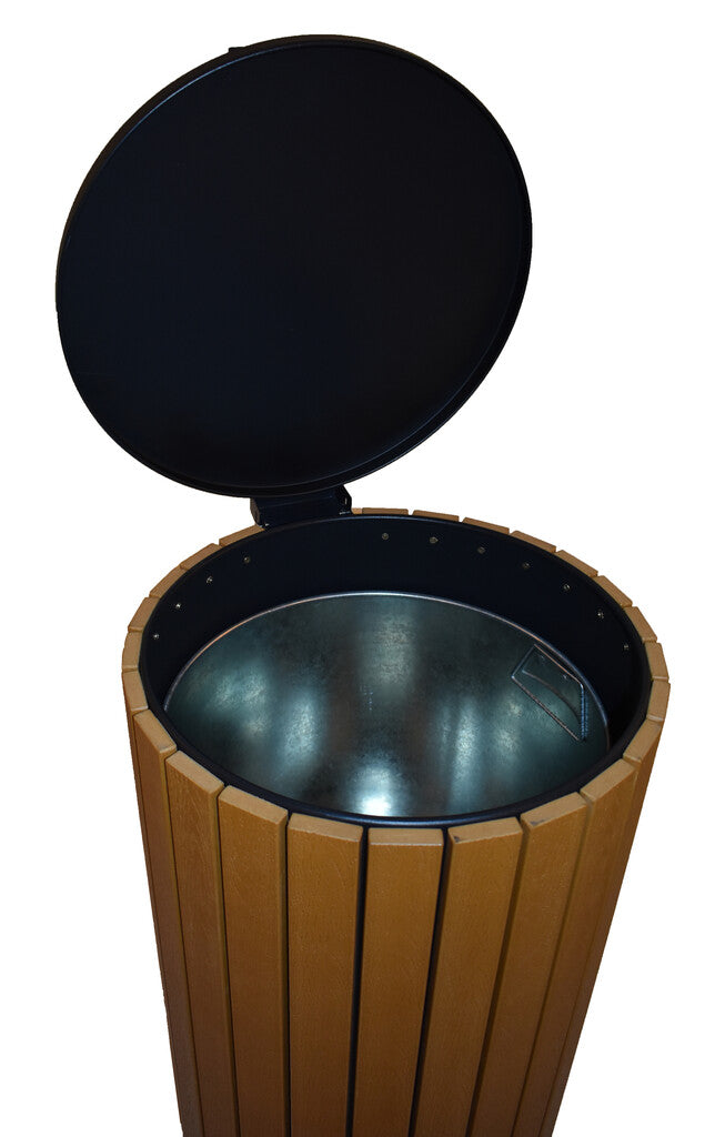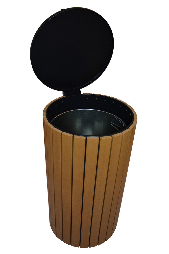 Robuuste, grote capaciteit afvalbak voorzien van deksel en verzinkte binnenemmer. De houtlook latten zijn vervaardigd van hoogwaardig kunststof. De onderzijde en scharnieren van de afvalbak zijn gemaakt van RVS. De gebruikte materialen zorgen ervoor dat de afvalbak goed beschermd is tegen weersomstandigheden. De afvalbak is daarmee geschikt voor vele buitenlocaties, zoals bij tankstations, (attractie)parken, evenemententerreinen of bij de entree van openbare voorzieningen en bedrijfspanden. Grondverankering mogelijk.