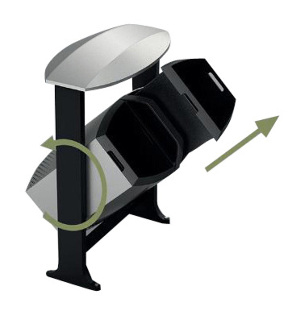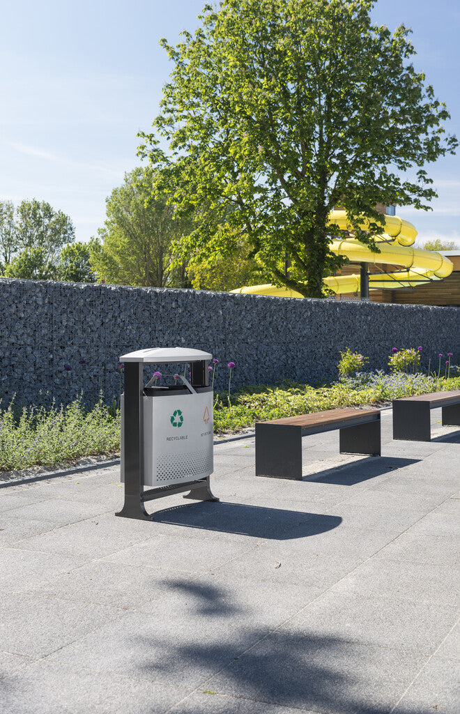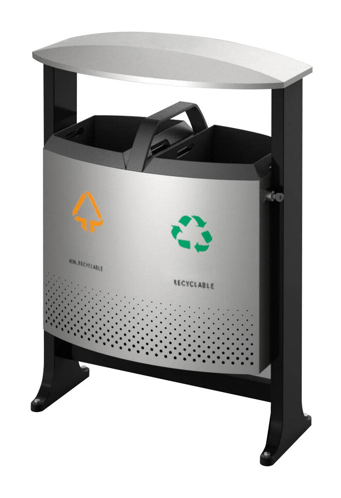 Recycling afvalbak van gepoedercoat staal met regendak, voorzien van 2 kunststof binnenbakken (2x 39 ltr). Zeer luxe vormgeving en afwerking. Afsluitbaar. Kantelsysteem voor eenvoudige toegang en het makkelijk legen van de afvalbak. Te bevestigen aan de grond.