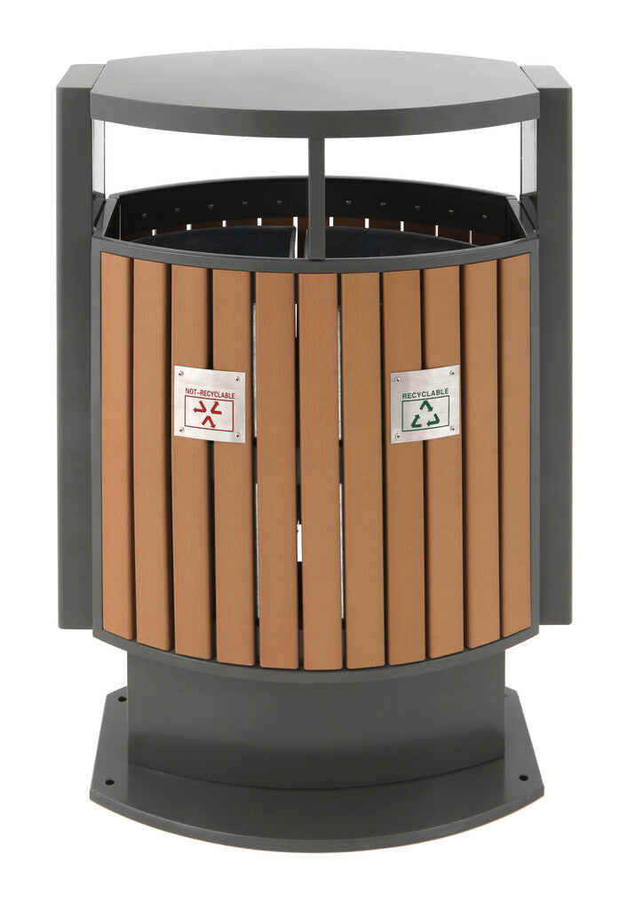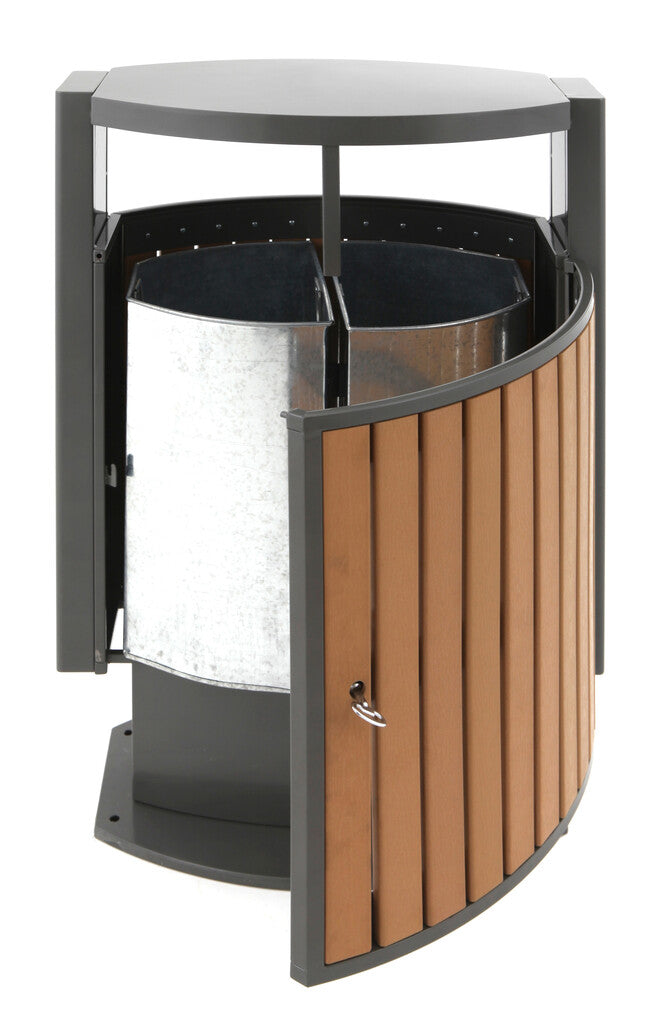 Recycling afvalbak van kunststof ‘houtlook’ latten en gepoedercoat stalen frame. Voorzien van regendak en gegalvaniseerde binnenbakken (2x 39 ltr). Afsluitbaar. Te bevestigen aan de grond.