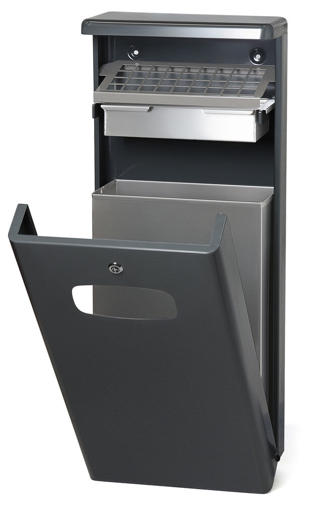Aluminium afvalbak en asbak met aluminium binnenbak. Voor wandbevestiging. Afmeting binnenbak 36,5x18 cm, hoogte 56,5 cm.