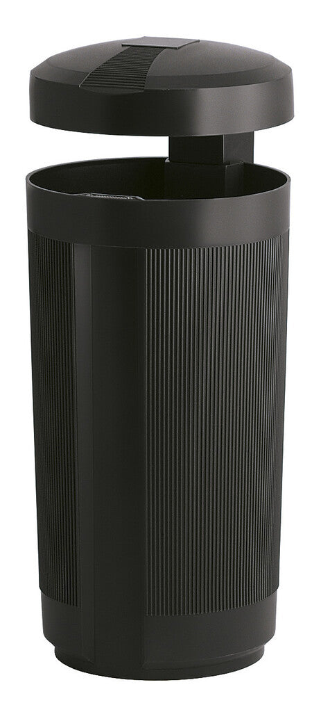 Afvalbak van UV-bestendig polyethyleen voor paal- of wandbevestiging met ruime inworpopening. Voorzien van driekantslot met sleutel. Door het losdraaien wordt de onderbak kantelbaar. De geribbelde buitenkant verhindert de aanplak van affiches en graffiti.
