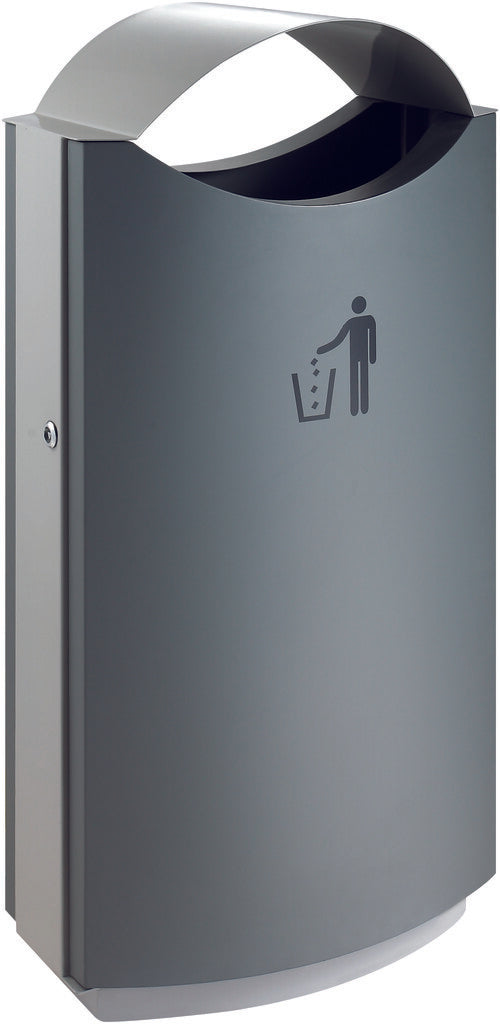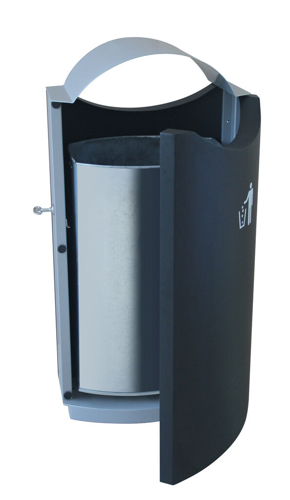 Fraai vormgegeven afvalbak van gepoedercoat staal met afdak. De metalen binnenbak is eenvoudig te legen via de deur aan de voorzijde.