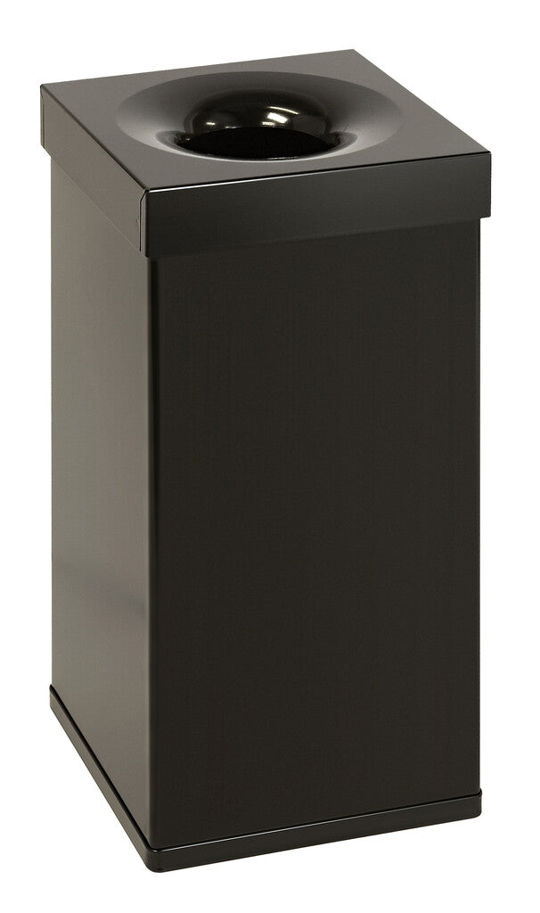 Vierkante vlamdovende papierbak. Onderbak vervaardigd uit hoogwaardig aluminium of RVS en deksel van RVS; alle onderdelen zijn gepoedercoat.