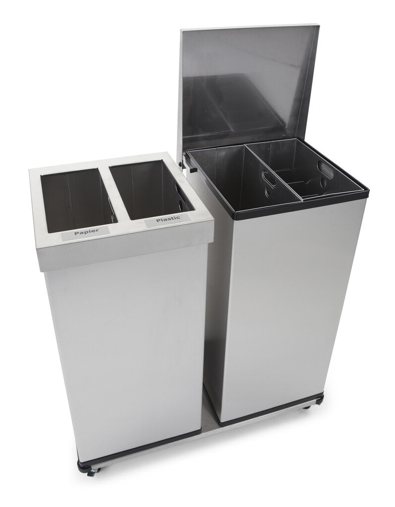 Afvalbak van RVS met liftdeksel. De afvalbak is voorzien van 2 aluminium binnenbakken waarvan een met inzet voor bekers. Zowel apart als in combinatie met de Dolly Duo en een tweede Carro-Lift of Carro Mix afvalbak zeer goed inzetbaar voor gescheiden afvalinzameling. Stickers voor aanduiding afvalstromen op aanvraag.