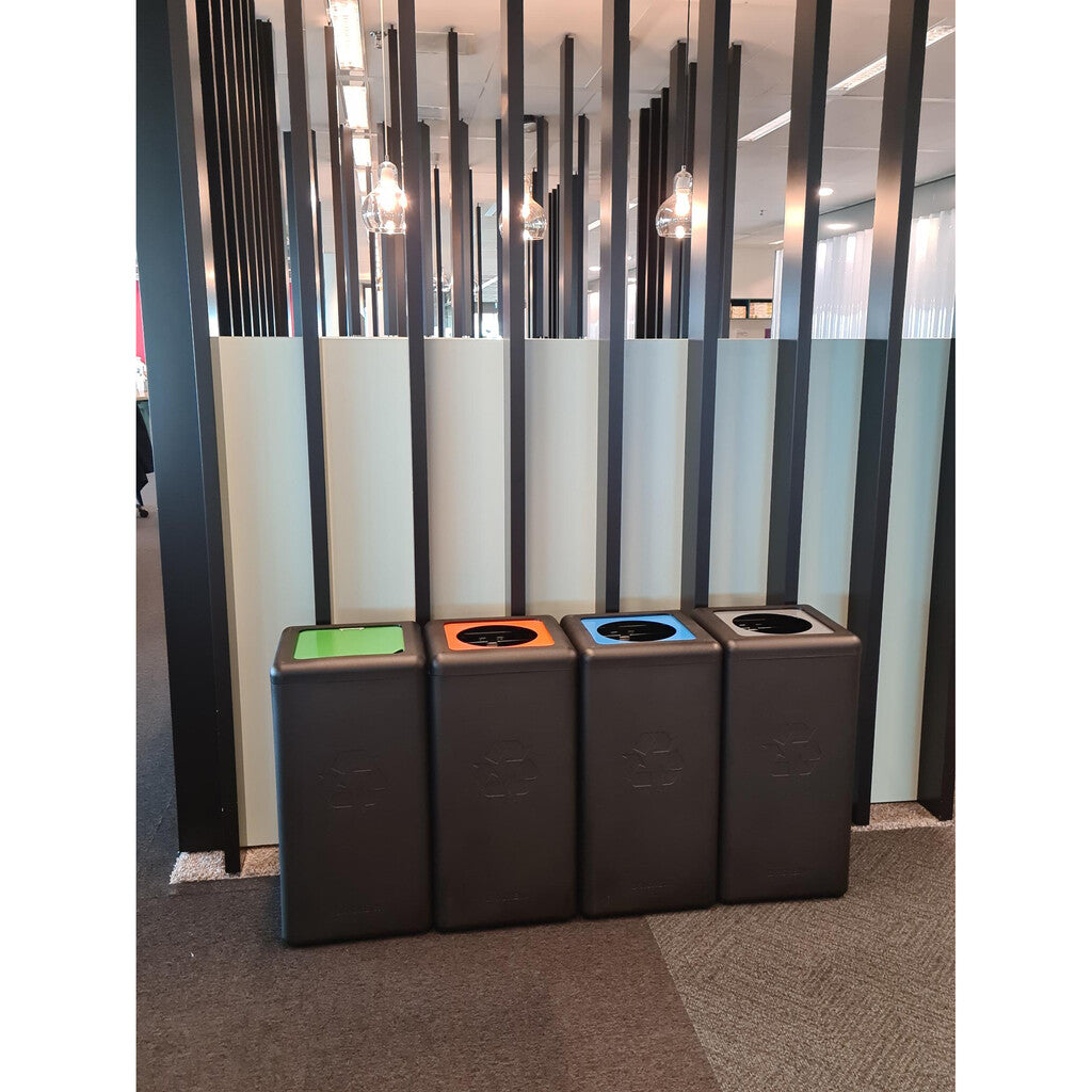Duurzame afvalbak van uw gerecyclede plastic om afval gescheiden in te zamelen. Nederlandse productie gemaakt van gerecycled plastic (HDPE) bestaande uit doppen en verpakkingen die middels een rotatiegietproces vervaardigd wordt. 100% circulair en wordt afgemonteerd bij sociale werkplekken. De afvalscheidingsunit heeft een scharnierend deksel met gekleurde aluminium plaat met klepdeksel (opening Ø 20 cm). Recycling stickers om de verschillende afvalstromen duidelijk te maken worden meegeleverd. De geïntegreerde zakhoudbeugels zorgen ervoor dat de afvalzak eenvoudig te klemmen is. Optioneel is er een kunststof schroevenset beschikbaar om meerdere bakken te koppelen tot afvalscheidingsstation. De Nederlandse fabrikant is gespecialiseerd in design producten van recyclebare materialen waardoor het zelfs mogelijk is om van ‘eigen’ afvalstromen customized afvalbakken te laten produceren. Vraag naar de mogelijkheden.