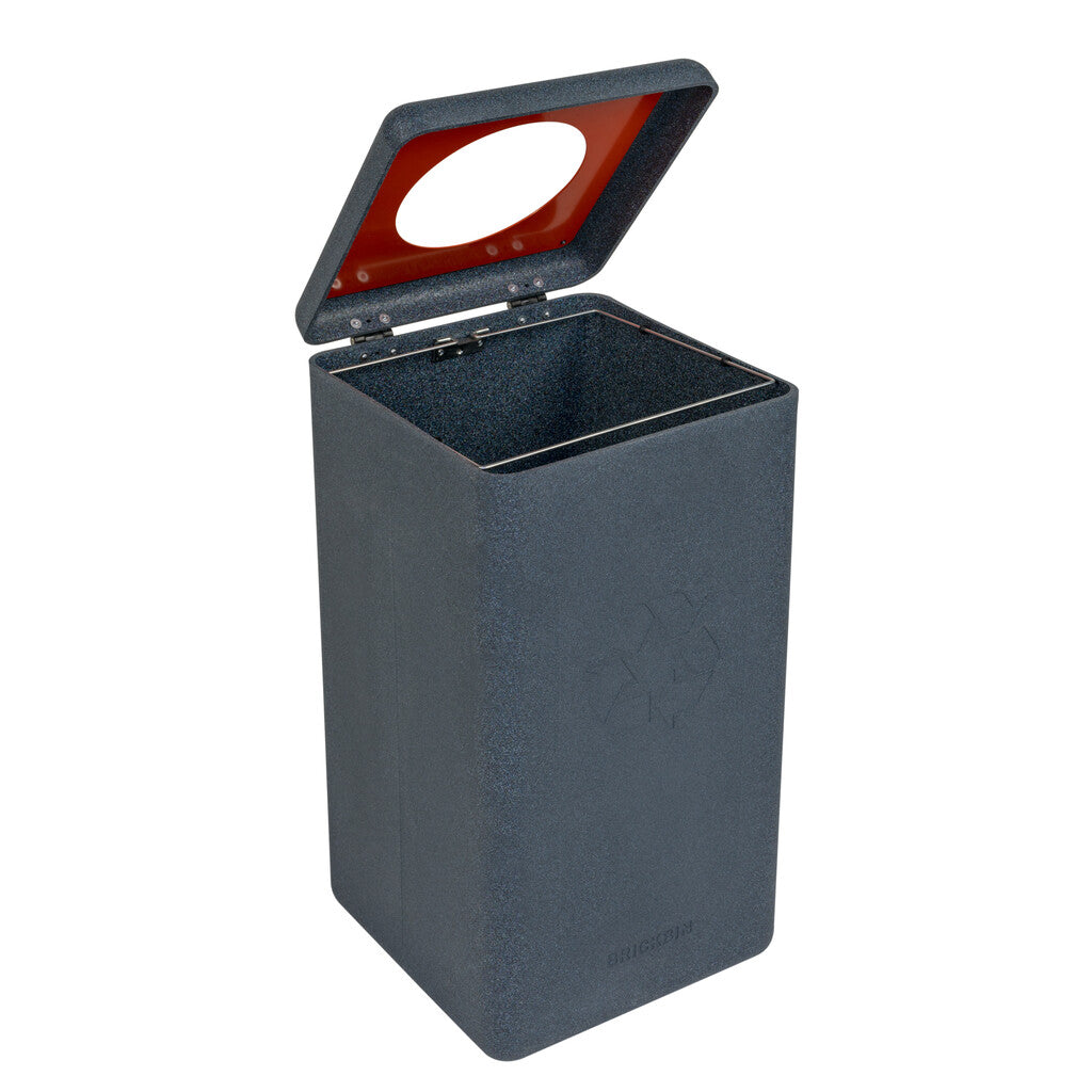 Duurzame afvalbak van uw gerecyclede plastic om afval gescheiden in te zamelen. Nederlandse productie gemaakt van gerecycled plastic (HDPE) bestaande uit doppen en verpakkingen die middels een rotatiegietproces vervaardigd wordt. 100% circulair en wordt afgemonteerd bij sociale werkplekken. De afvalscheidingsunit heeft een scharnierend deksel met gekleurde aluminium plaat met opening (Ø 20 cm). Recycling stickers om de verschillende afvalstromen duidelijk te maken worden meegeleverd. De geïntegreerde zakhoudbeugels zorgen ervoor dat de afvalzak eenvoudig te klemmen is. Optioneel is er een kunststof schroevenset beschikbaar om meerdere bakken te koppelen tot afvalscheidingsstation. De Nederlandse fabrikant is gespecialiseerd in design producten van recyclebare materialen waardoor het zelfs mogelijk is om van ‘eigen’ afvalstromen customized afvalbakken te laten produceren. Vraag naar de mogelijkheden.
