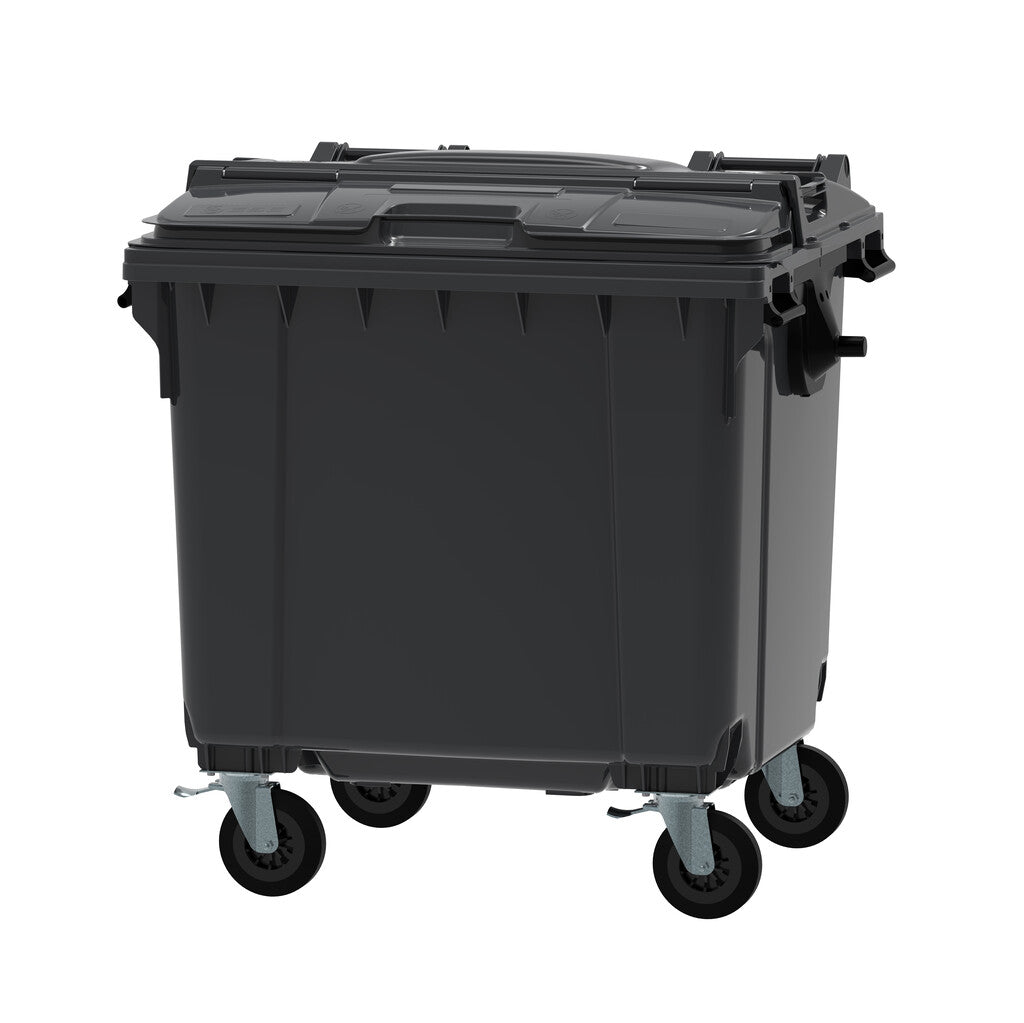 Grote capaciteit 4-wiel container van hoogwaardig kunststof (HDPE) met split deksel. Het deksel uit twee delen maakt het eenvoudiger en minder zwaar om het deksel te openen, hierdoor is de container makkelijk toegankelijk. Het flexibele split deksel voorkomt tevens schade aan het deksel bij het legen van de container. Voorzien van vier ergonomische handgrepen aan de zijkant en vier rubberen wielen waarvan twee met rem. Inclusief opnametap om de container aan de belader te kunnen hangen voor het ledigen.