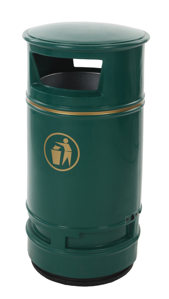 Kunststof, UV-bestendige afvalbak voor stad of park met metalen binnenemmer.