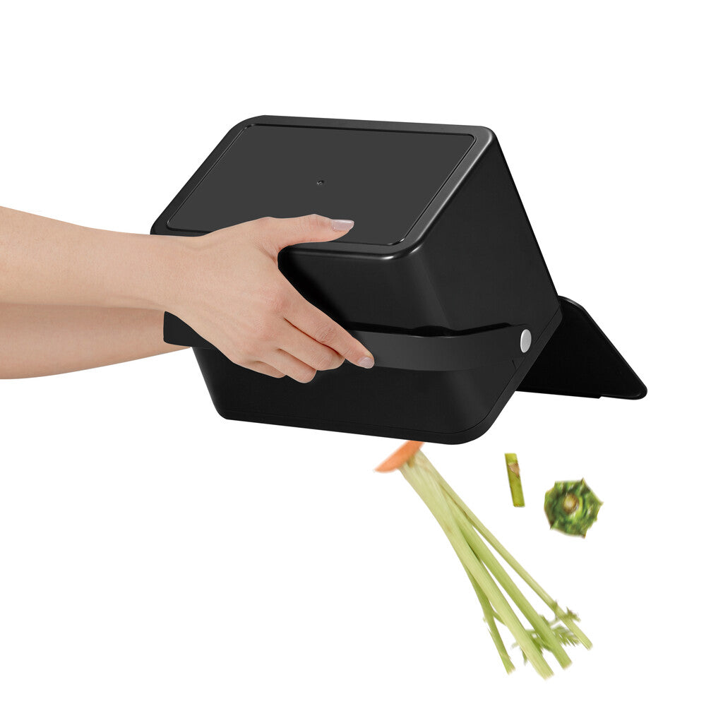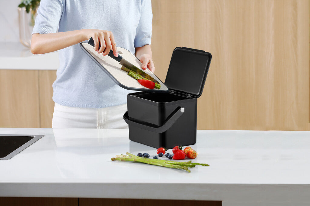 Compact afvalbakje van kunststof voor GFT-afval. Voorzien van handig hengsel om makkelijk te verplaatsen. Het bakje met antibacteriële technologie dat nare geurtjes voorkomt, heeft een verwijderbaar frame om de compostzak op zijn plaats te houden. Ideaal in de keuken om groente en fruitafval in weg te gooien tijdens het koken.