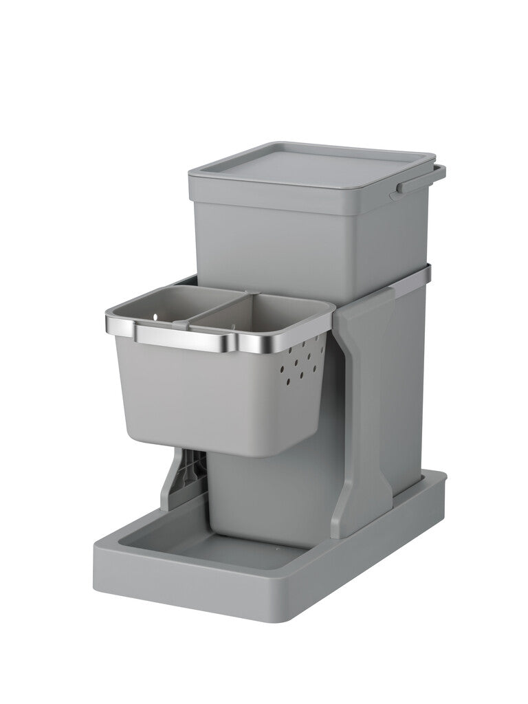 Inbouw afvalbak in stevige stalen contructie voor in een (keuken) kastje. Gemakkelijk uit te schuiven op de gladde kogellager geleiders, met de handvat aan de voorzijde. Voorzien van een afvalbak van 20L en een klein bakje met een inhoud van 4L voor het scheiden van het afval en handvatten aan de zijkant voor het makkelijk verplaatsen.