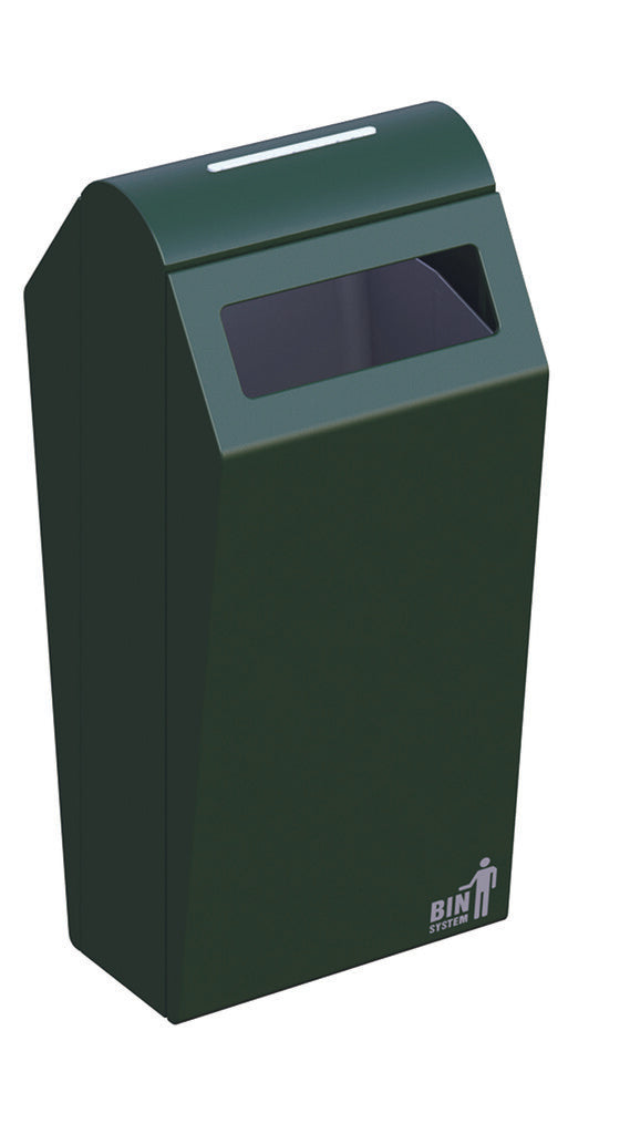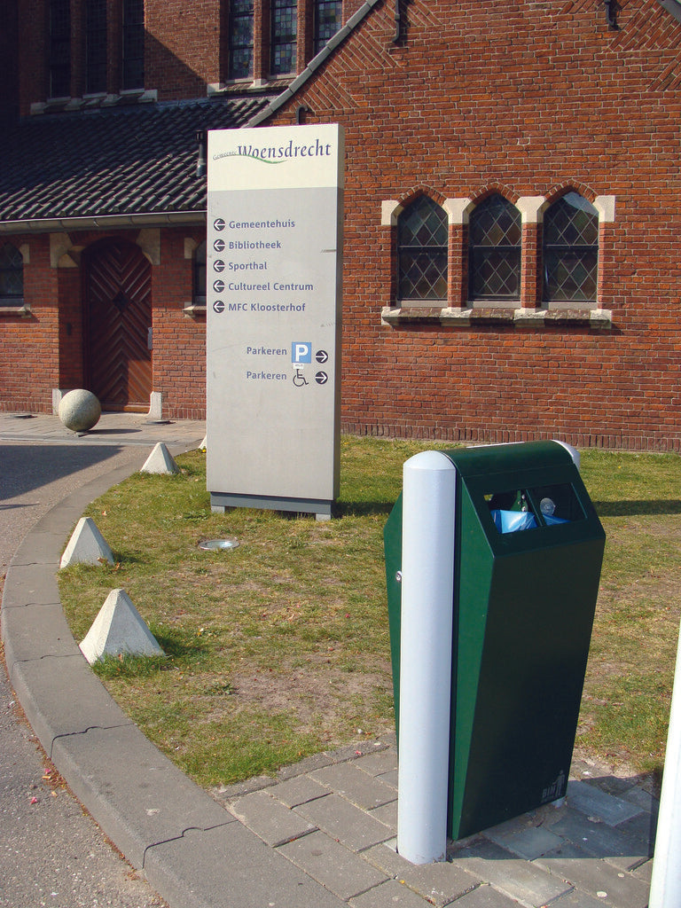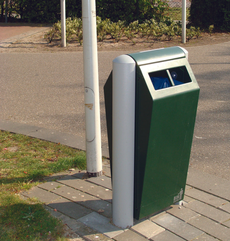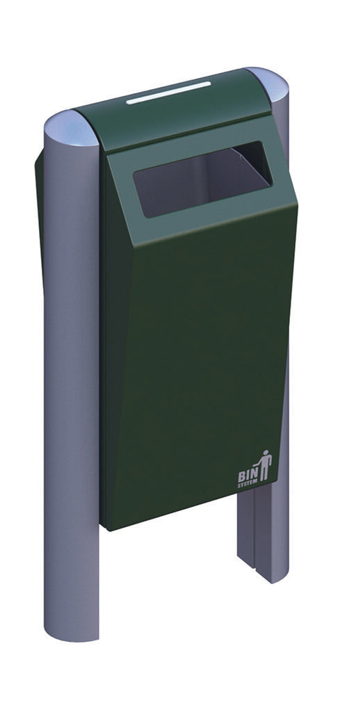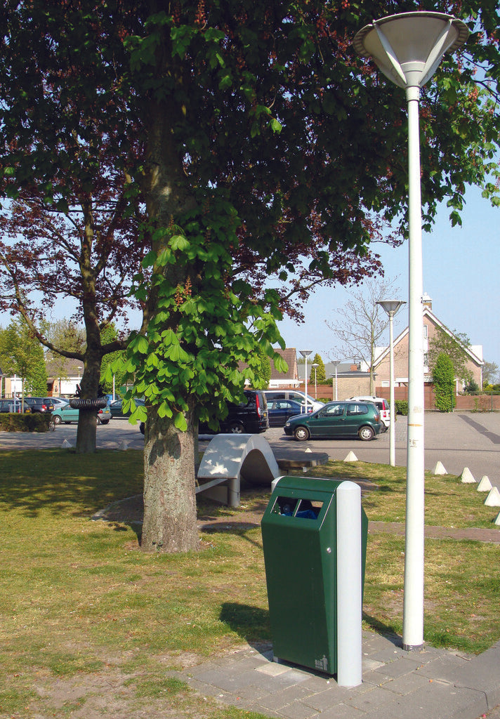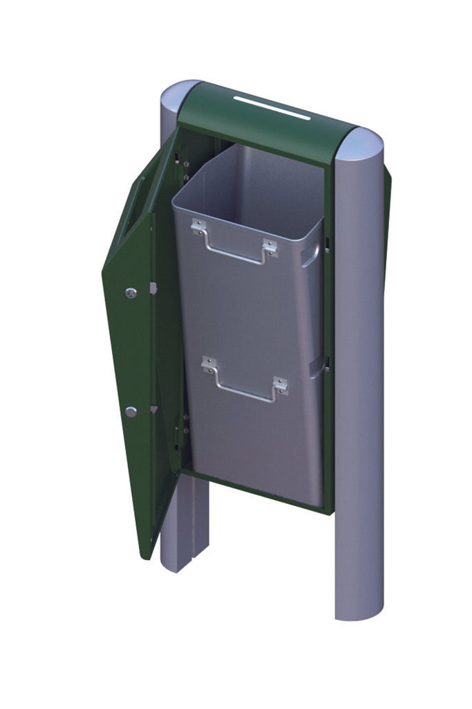 Fraai vormgegeven, robuuste buitenafvalbak van hoogwaardig, gepoedercoat verzinkt staal met inworpopening aan beide zijden. Met een meegeleverde driekantsleutel is de afvalbak eenvoudig en snel te ontgrendelen. Door het openen van de deur is de robuuste, maar lichte aluminium binnenbak (70 liter) vrij toegankelijk en eenvoudig te ledigen. Duurzaam en vandalismebestendig. Te bevestigen tussen aluminium profielstaanders in de grond. Ideaal voor plaatsing in een (attractie)park, nabij een winkelcentrum of openbare gelegenheden zoals scholen, ziekenhuizen, sport- en bedrijfsterreinen.