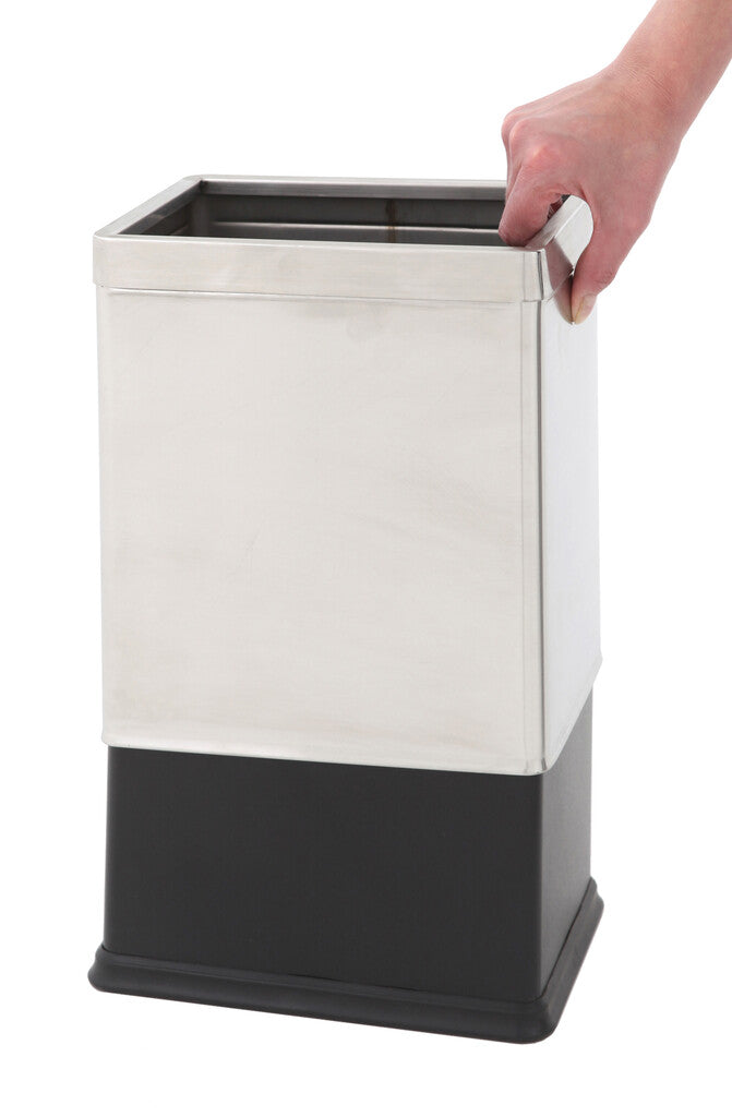 Dubbelwandige rechthoekige papierbak aan de buitenzijde van mat RVS. Stalen binnenzijde zwart gepoedercoat.