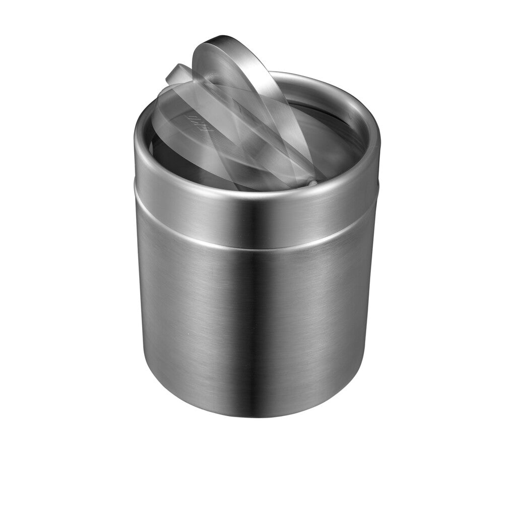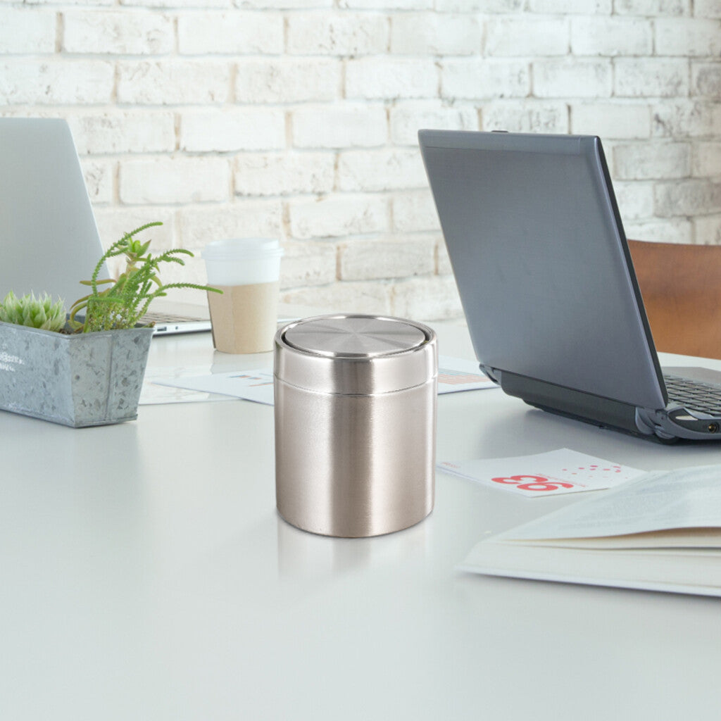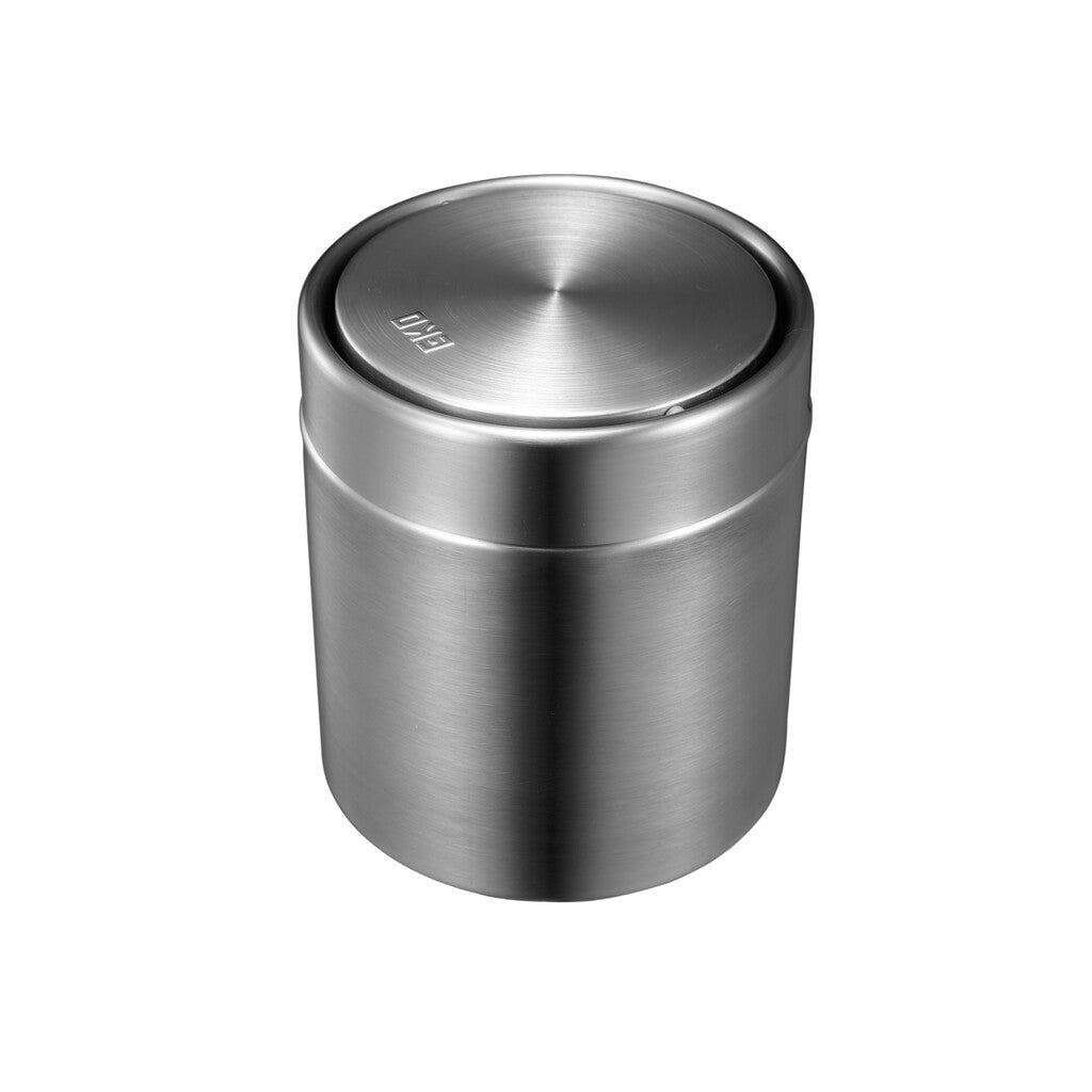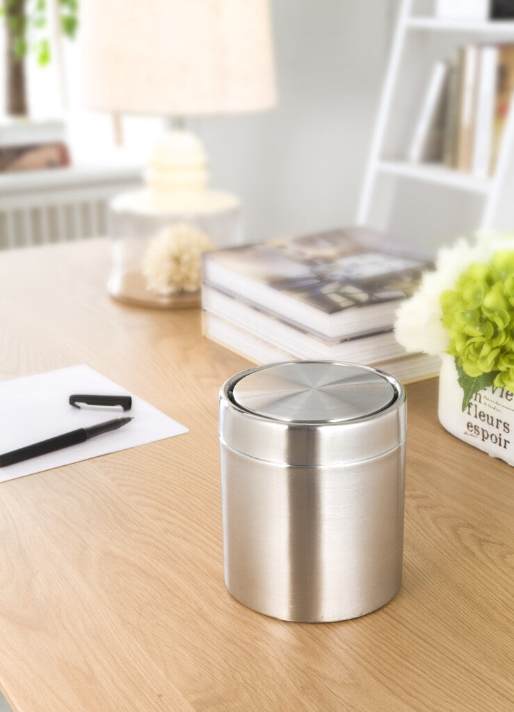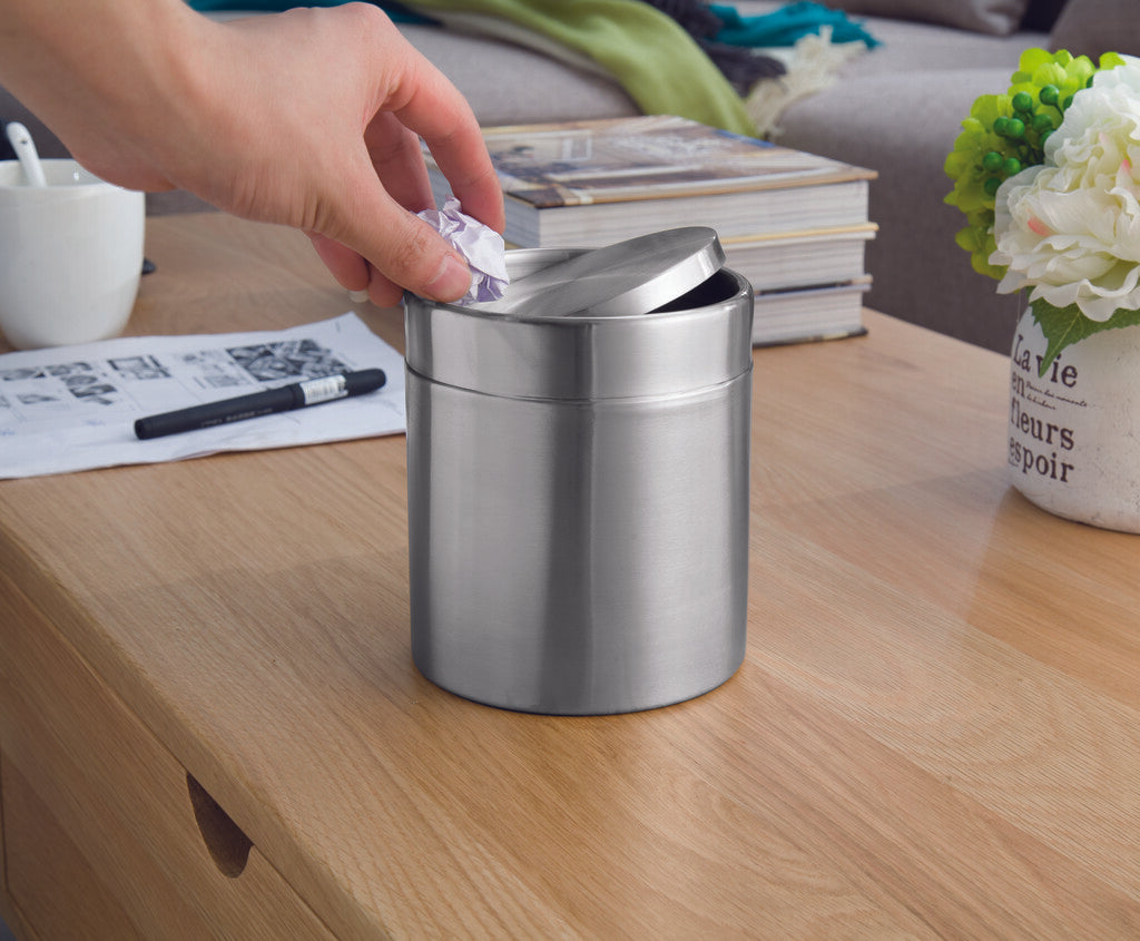 Mooi vormgegeven tafelafvalbakje van mat RVS. Het handige vlakke swingdeksel sluit automatisch na gebruik.