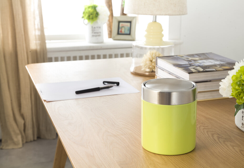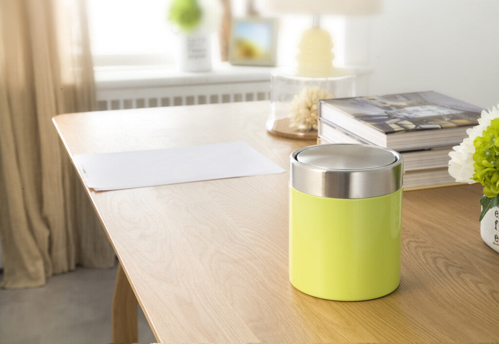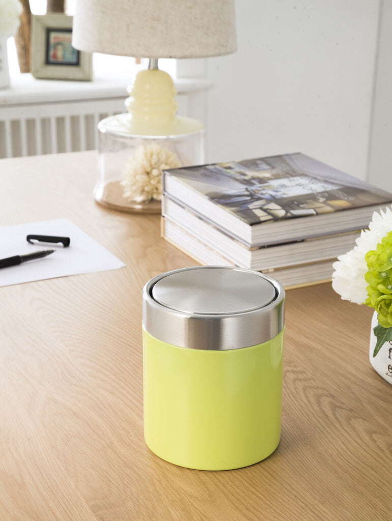 Mooi vormgegeven tafelafvalbakje van gepoedercoat staal. Het handige mat RVS, vlakke swingdeksel sluit automatisch na gebruik.
