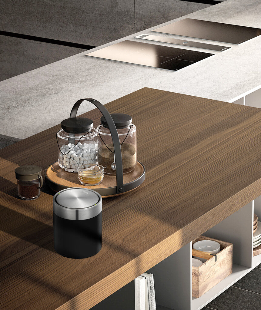 Mooi vormgegeven tafelafvalbakje van gepoedercoat staal. Het handige mat RVS, vlakke swingdeksel sluit automatisch na gebruik.