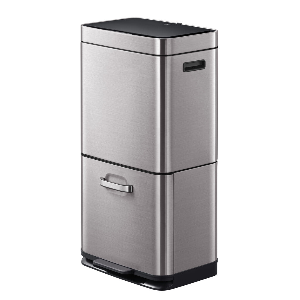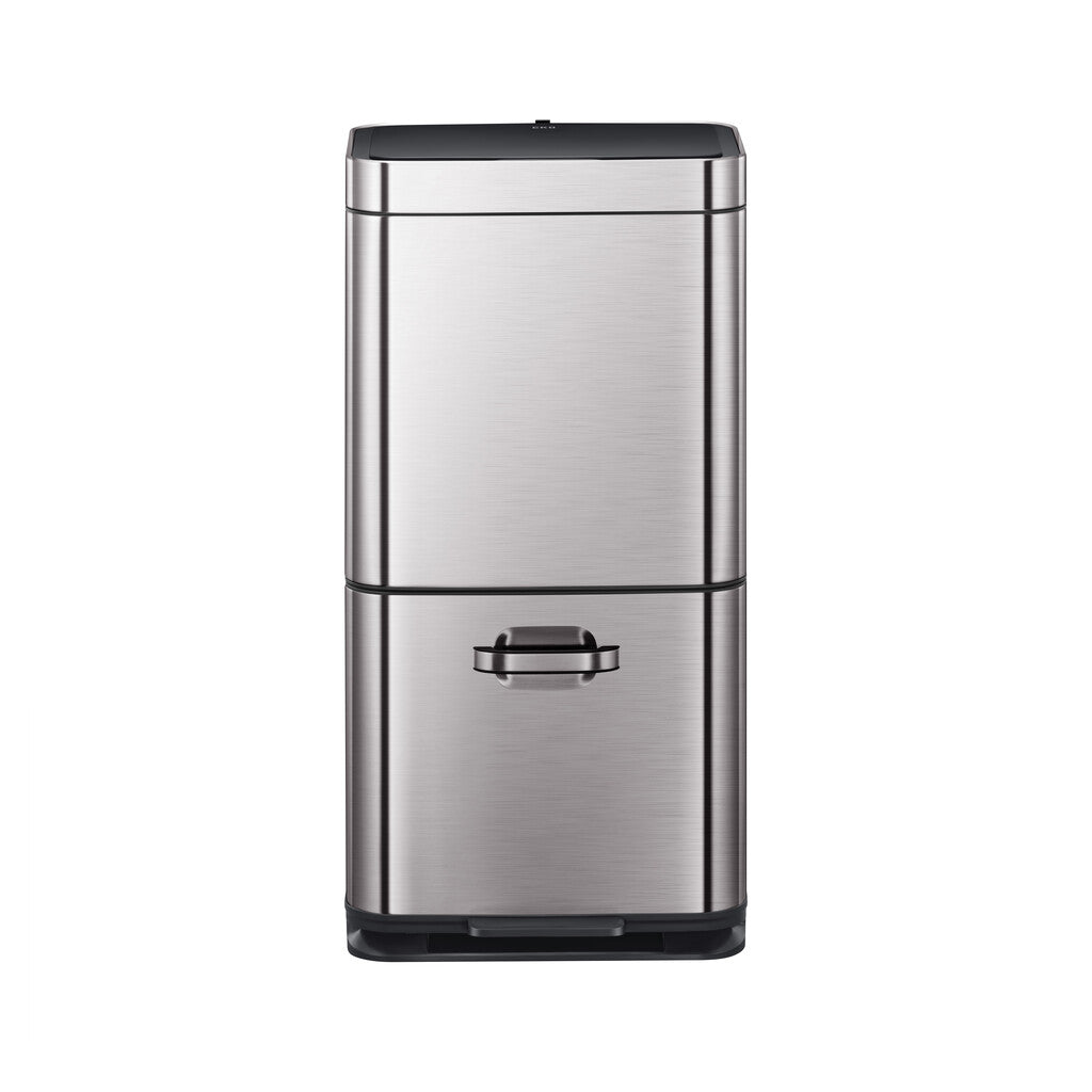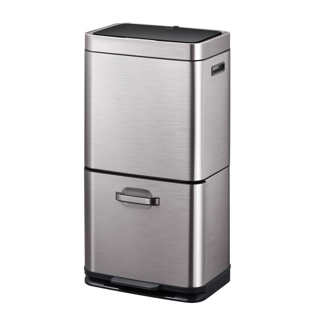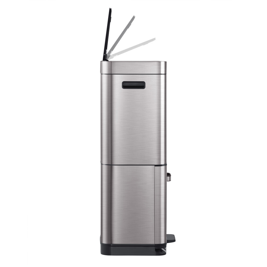 Gestapelde sensor afvalbak voor optimale ruimtebesparing. De afvalscheider van grijs mat RVS met fingerprint proof coating biedt via het deksel dat geopend wordt door het sensormechanisme toegang tot een groot compartiment van 35 liter. Daaronder zit een compartiment van 25 liter dat zowel via het handvat als via het pedaal toegankelijk is. De sensorbediening zorgt voor een hygiënisch gebruik en sluit het deksel geruisloos. Door het afneembare deksel zijn de afvalzakken eenvoudig te wisselen. Werkt op 4 AA batterijen (niet inbegrepen).