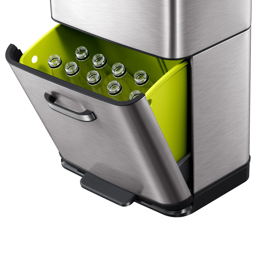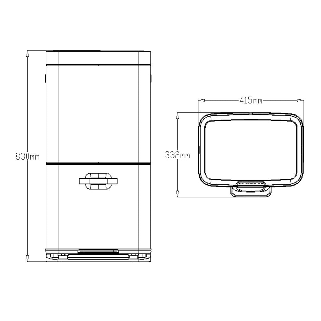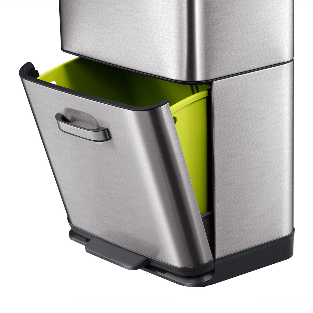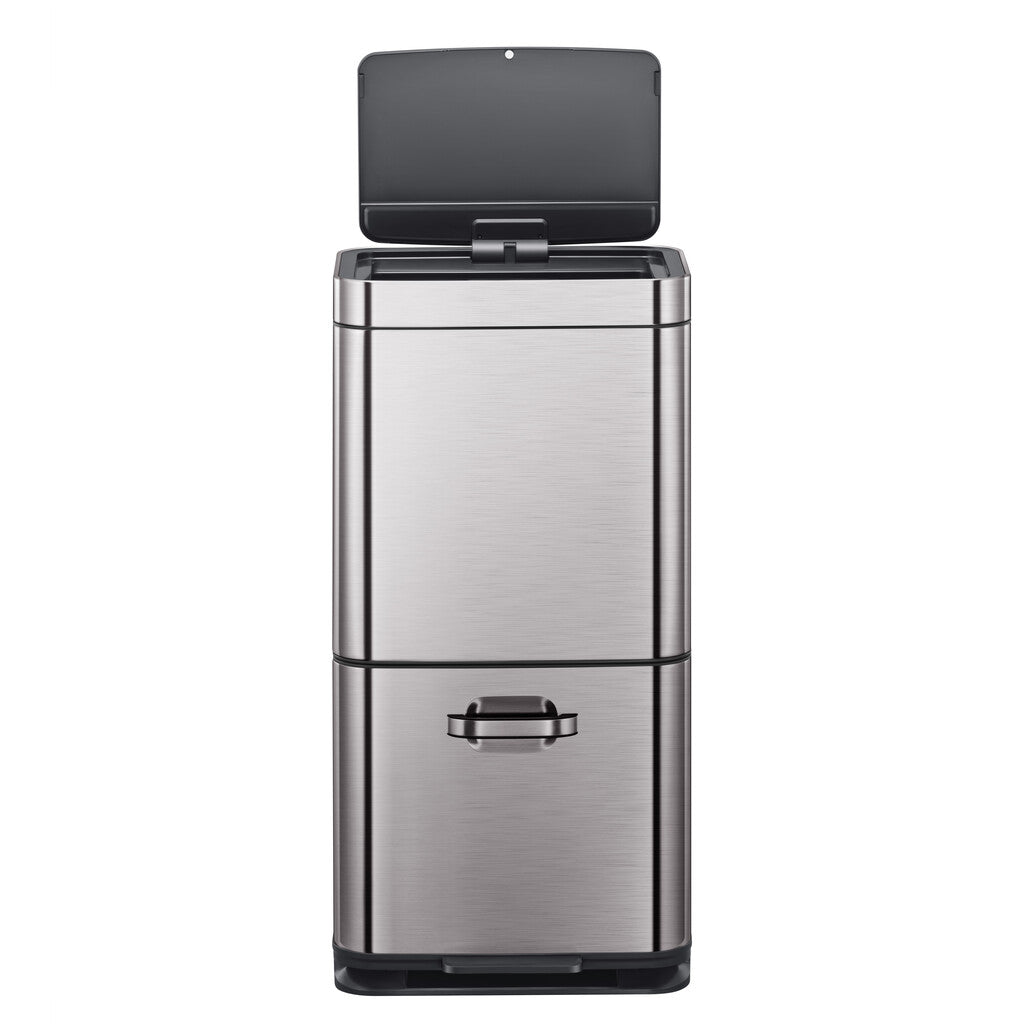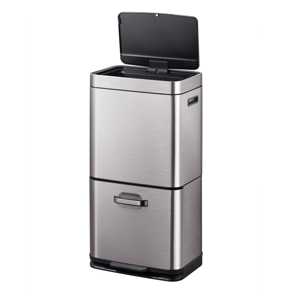 Gestapelde sensor afvalbak voor optimale ruimtebesparing. De afvalscheider van grijs mat RVS met fingerprint proof coating biedt via het deksel dat geopend wordt door het sensormechanisme toegang tot een groot compartiment van 35 liter. Daaronder zit een compartiment van 25 liter dat zowel via het handvat als via het pedaal toegankelijk is. De sensorbediening zorgt voor een hygiënisch gebruik en sluit het deksel geruisloos. Door het afneembare deksel zijn de afvalzakken eenvoudig te wisselen. Werkt op 4 AA batterijen (niet inbegrepen).
