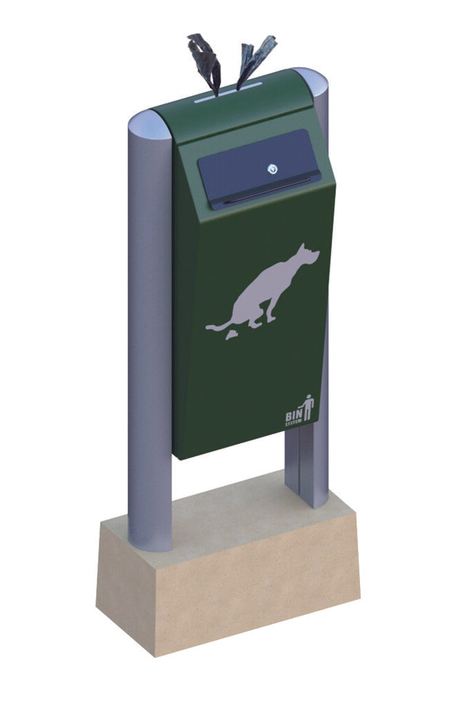 Fraai vormgeven, robuuste buitenafvalbak van hoogwaardig, gepoedercoat verzinkt staal voorzien van een dispenser met plastic zakjes voor hondenpoep. Deze BINsystem afvalbak wordt compleet met aluminium profielstaanders en betonblok geleverd. Met een meegeleverde driekantsleutel is de afvalbak eenvoudig en snel te ontgrendelen. Door het openen van de deur is de robuuste, maar lichte aluminium binnenbak (50 liter) vrij toegankelijk en eenvoudig te ledigen. Bij opening is tevens de dispenser bereikbaar voor het vervangen van de rol(len) met hondenpoepzakjes. Duurzaam en vandalismebestendig. Ideaal voor plaatsing in parken en woonwijken.