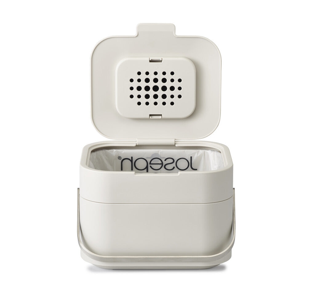 Compact kunststof afvalbakje met een inhoud van 4 liter, speciaal voor GFT-afval. Voorzien van RVS hengsel, deksel met geurfilter en afvalzakring. Beschikt over een uniek luchtventilatiesysteem dat helpt nare luchtjes te voorkomen. Custom-fit afvalzakken en geurfilters apart verkrijgbaar. Handig om tijdens het koken op het aanrecht te zetten.