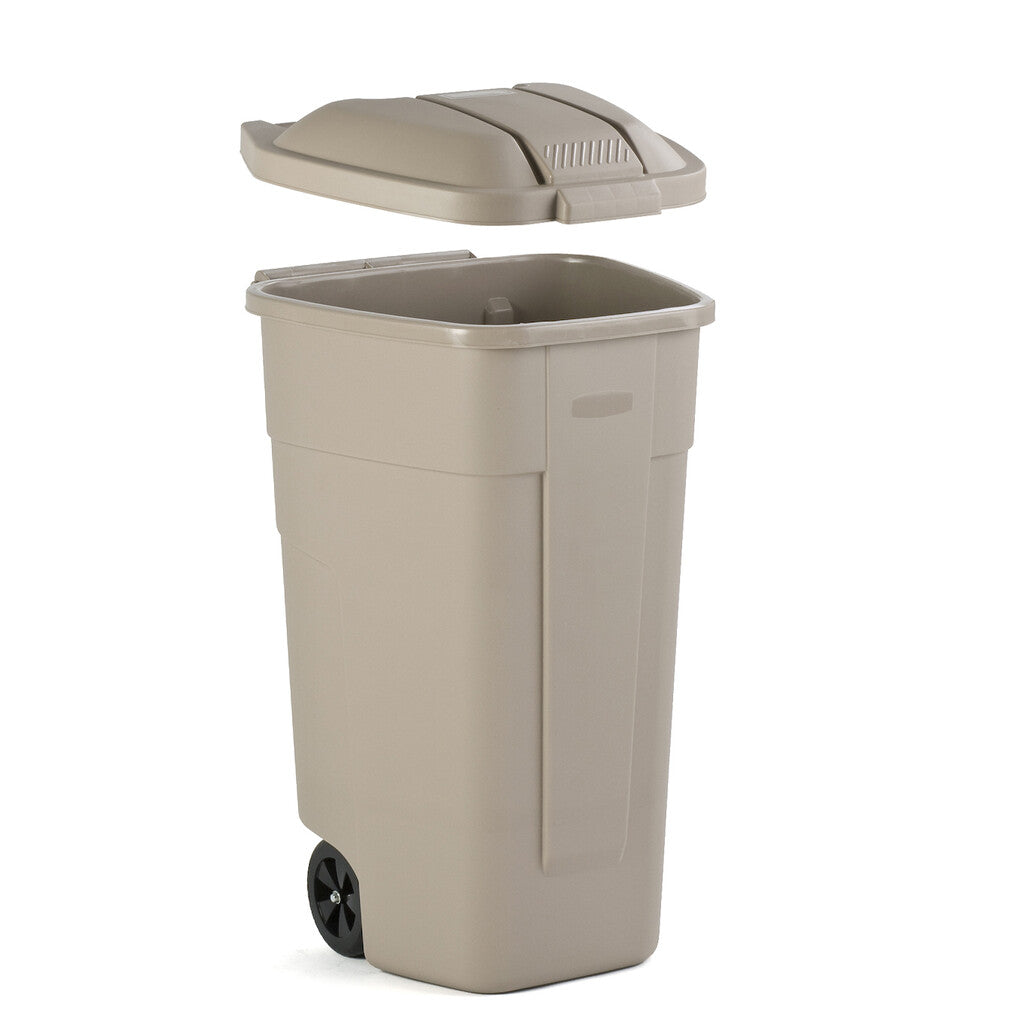 Mobiele container van polypropyleen met gekleurd scharnierend deksel en voorzien van ergonomische handgrepen. De verzonken wielen besparen ruimte. De constructie uit kunststof roest, deukt, splintert of schilfert niet. Het deksel onttrekt het afval aan het zicht en houdt geurtjes binnen. Ingebouwde grepen maken het tillen makkelijk.