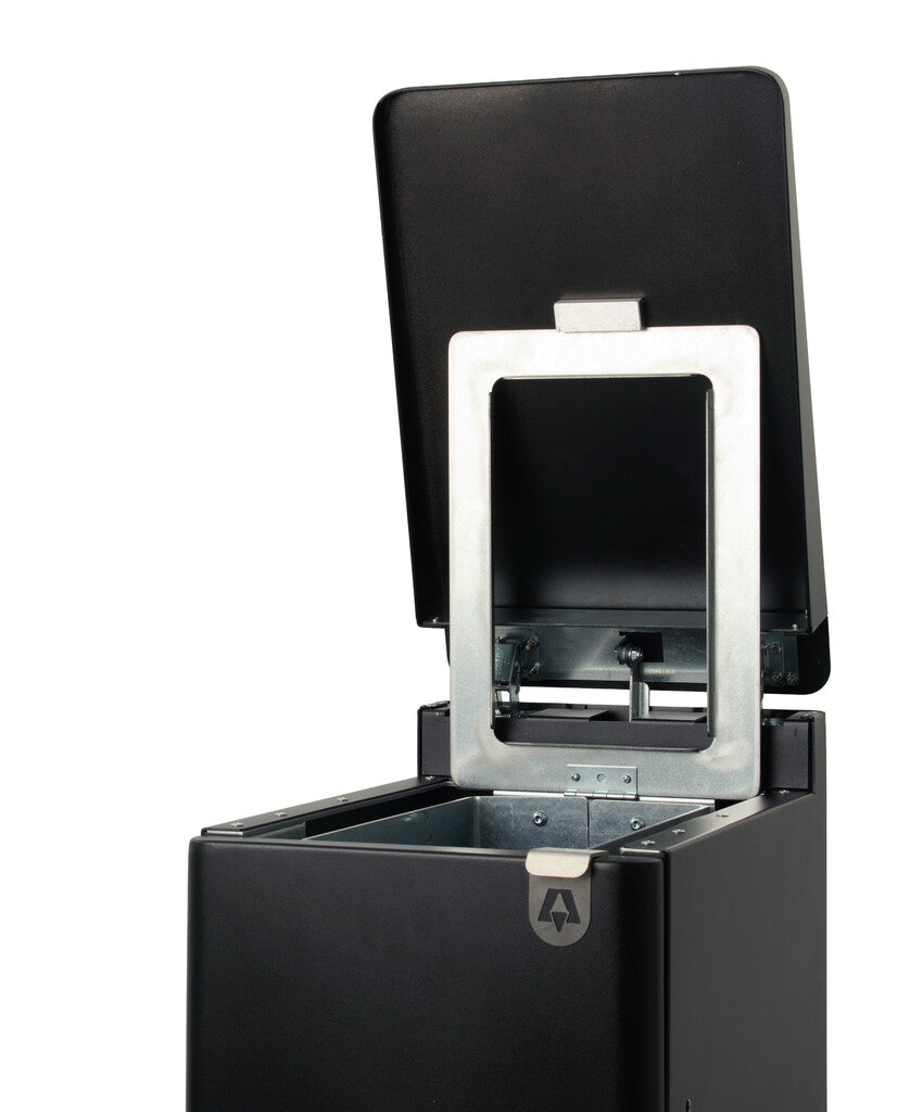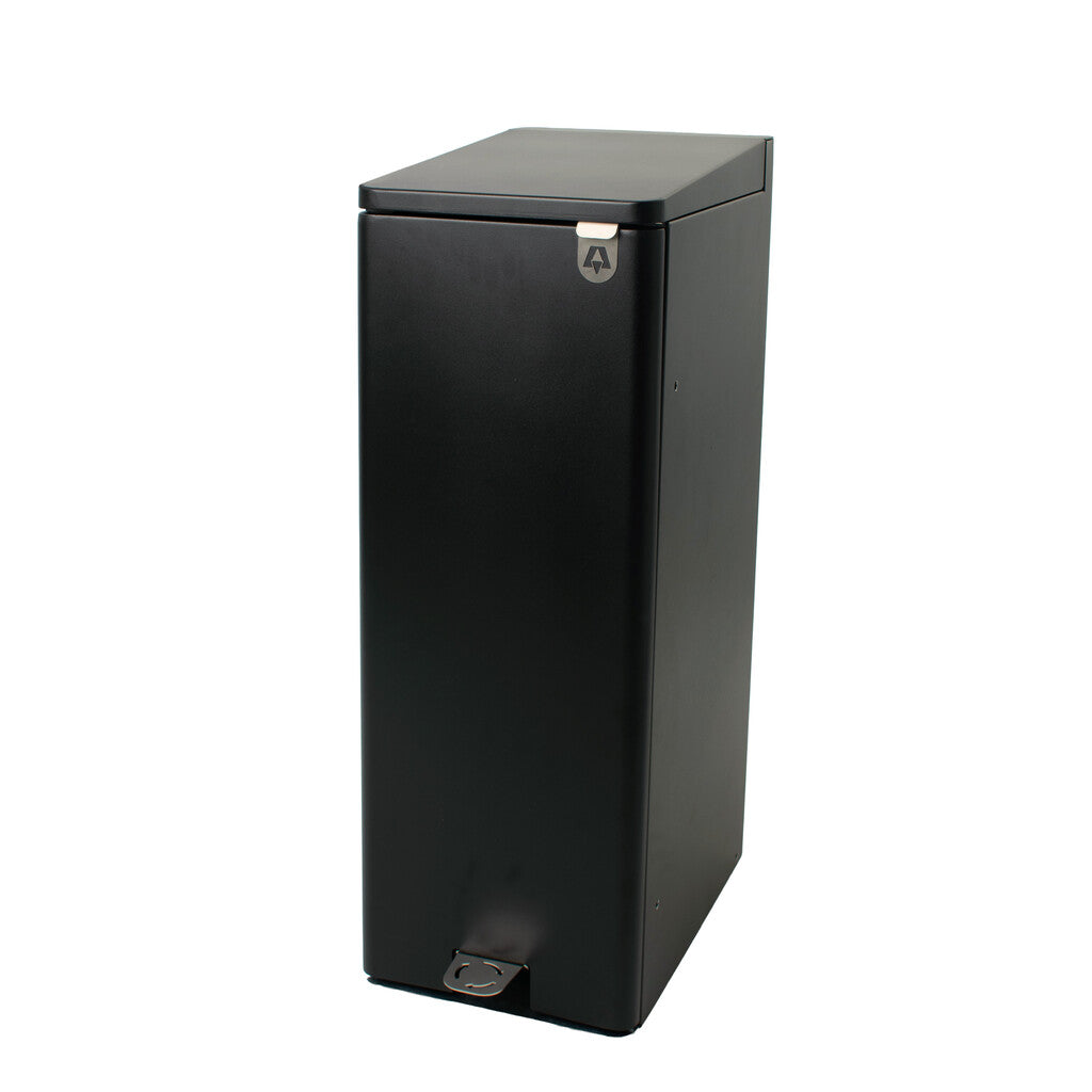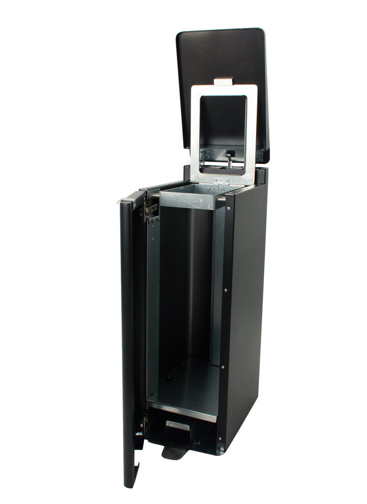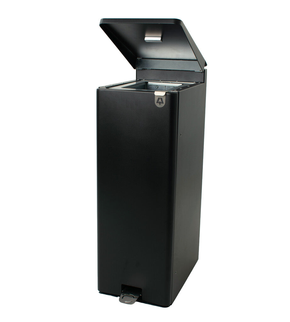 Het strak vormgegeven design in gepoedercoat aluminium is niet alleen stijlvol, maar ook robuust en onderhoudsvriendelijk. De pedaalemmer is voorzien van een aflopend soft-close deksel, zodat er geen voorwerpen op geplaatst kunnen worden. Het deurpaneel aan de voorkant opent eveneens met een soft-close mechanisme, wat zorgt voor ergonomisch en comfortabel vervangen van de afvalzak. De stay-open functie maakt het legen nóg gemakkelijker.