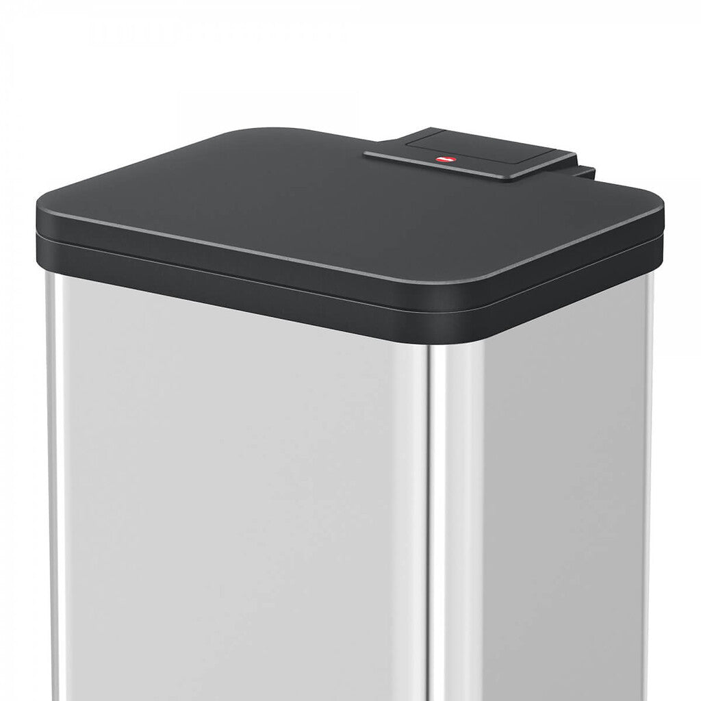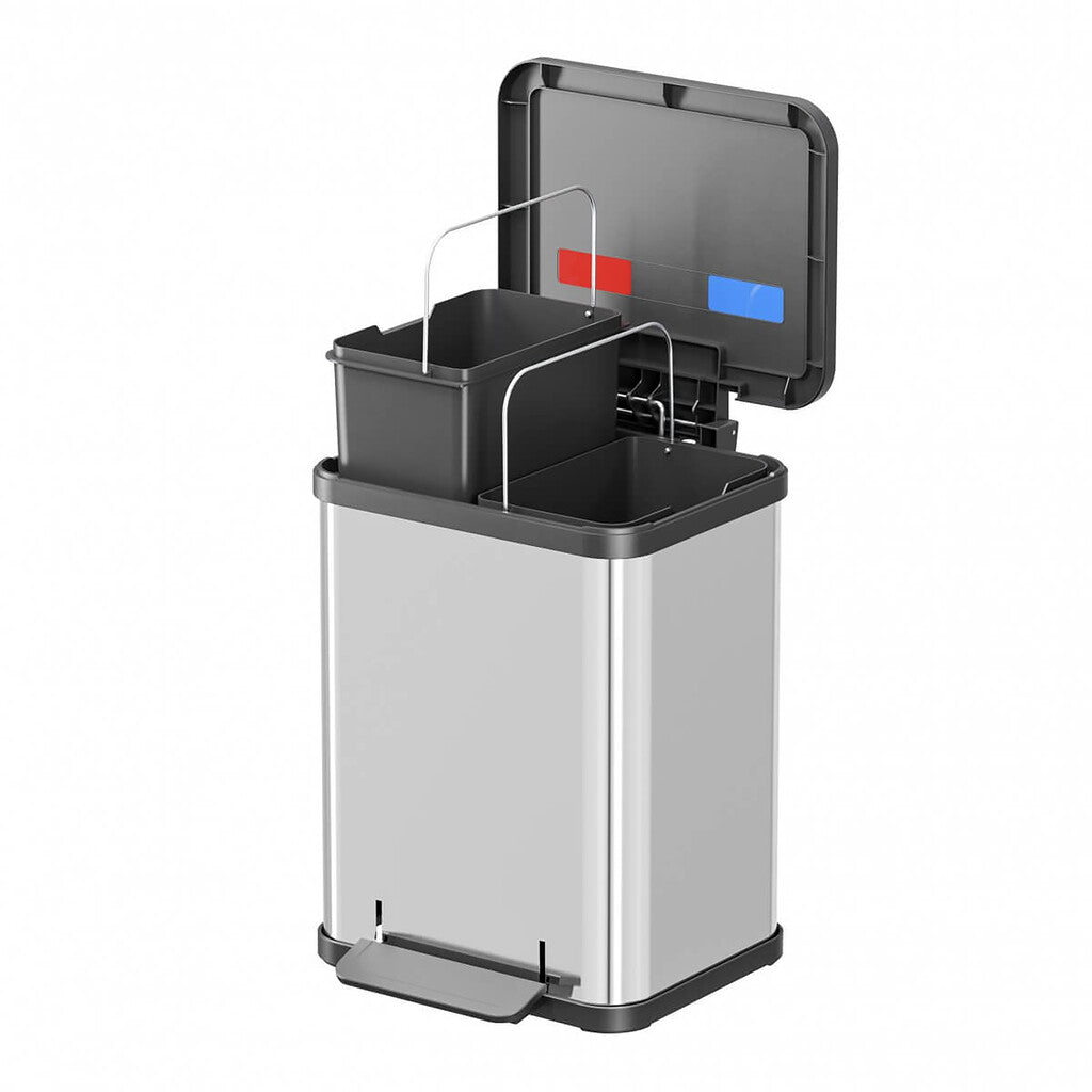 Rechthoekige pedaalemmer met zwart kunststof gedempt sluitend deksel en twee uitneembare kunststof binnenemmers voor afvalscheiding.