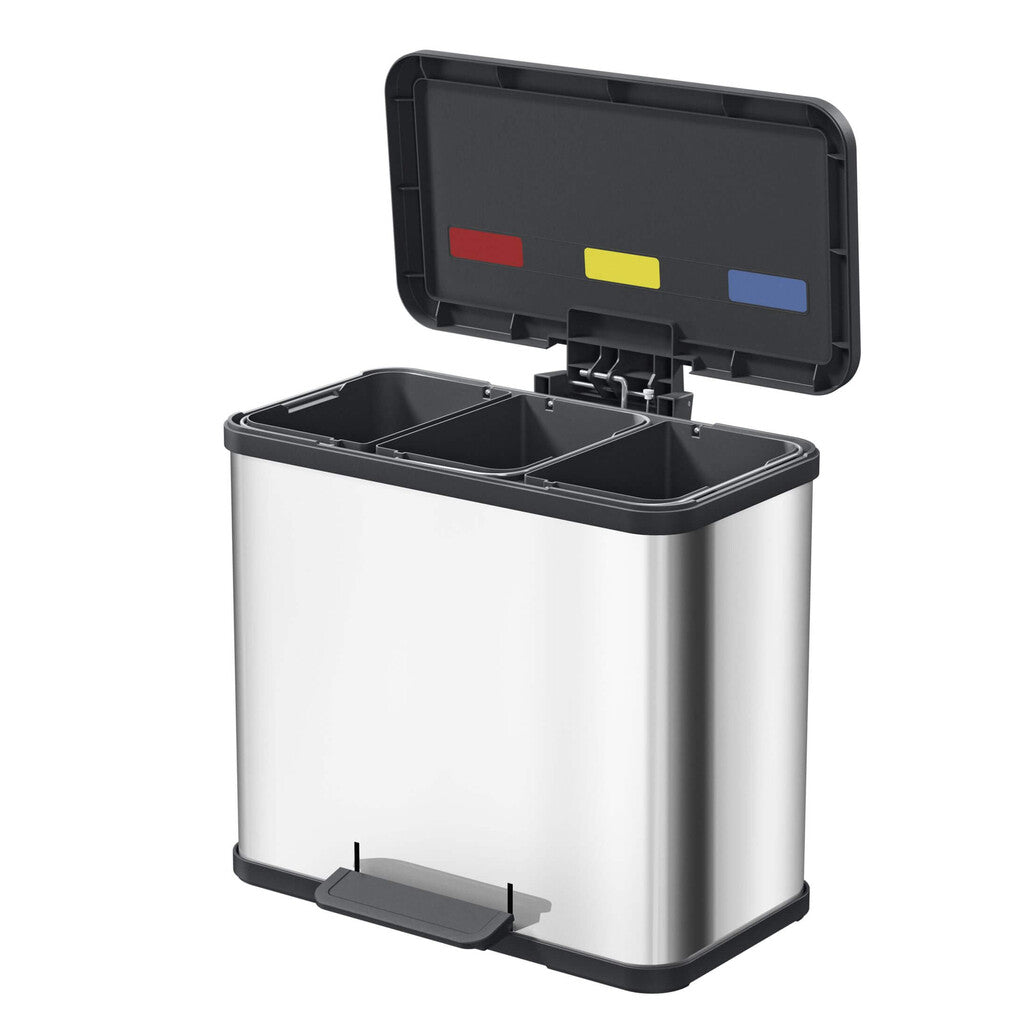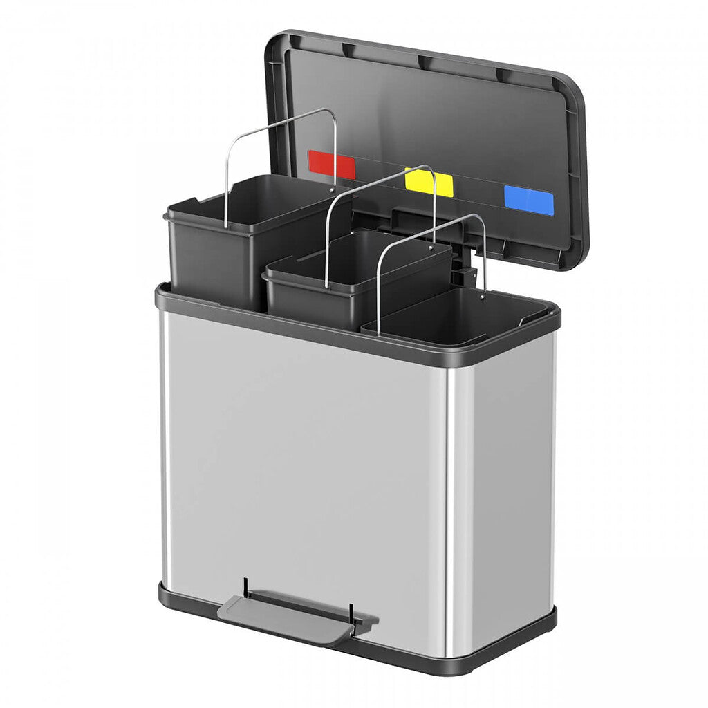 Rechthoekige pedaalemmer met zwart kunststof gedempt sluitend deksel en drie uitneembare kunststof binnenemmers voor afvalscheiding.