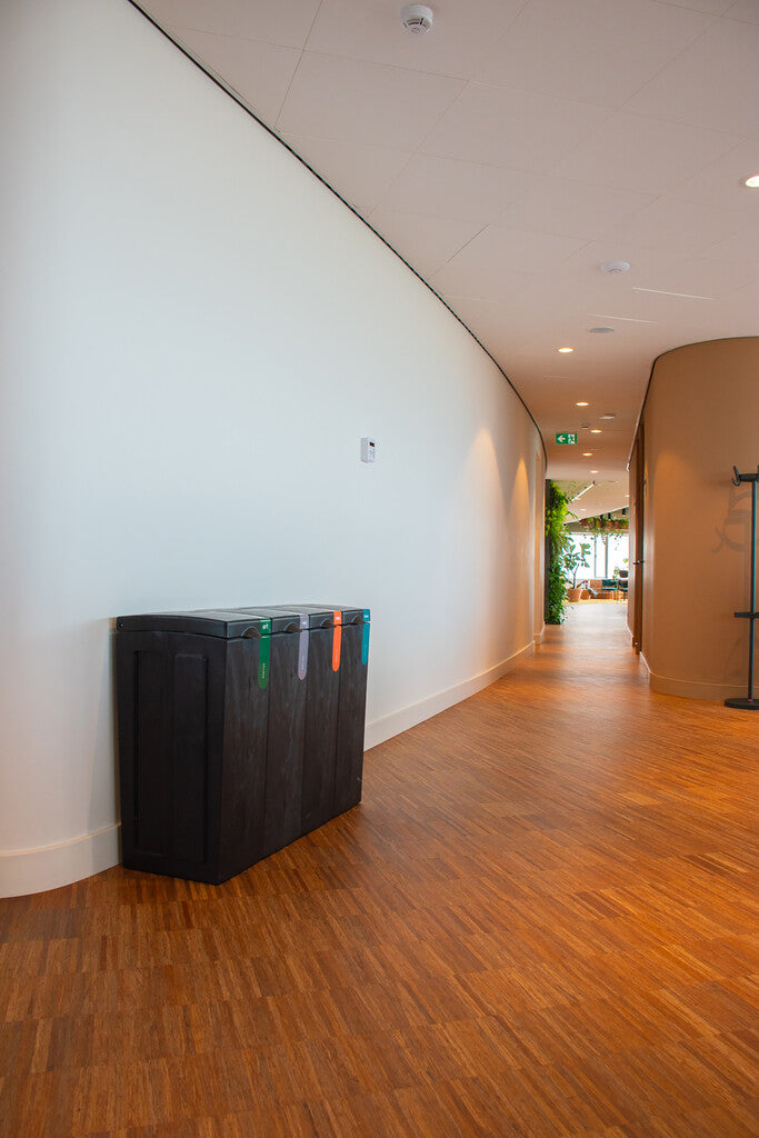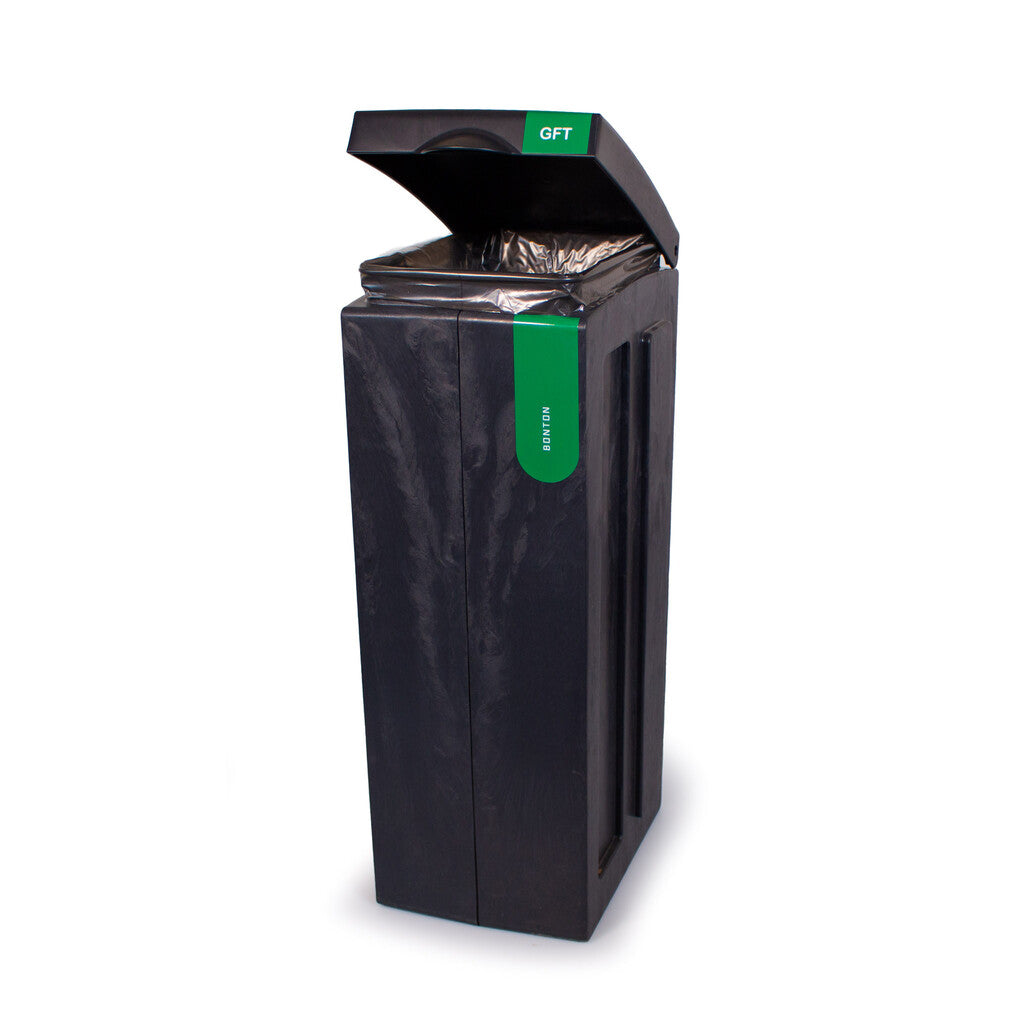 Circulaire afvalscheidingsmodule van 100% gerecycled polypropyleen uit bouw- en sloopafval en grofvuil. Doordat er bij de productie gebruik is gemaakt van gerecyclede kunststoffen heeft iedere unit een uniek uiterlijk. Modulair systeem, klik eenvoudig verschillende modules aan elkaar tot een complete afvalscheidingsunit. De module heeft een kunststof binnenemmer en is voorzien van een gekleurde sticker om de afvalstroom aan te duiden (Nederlandse tekst). De Bonton Original is tevens zonder bestickering leverbaar. Afwijkende stickers op aanvraag. Perfect passende afvalzakken om de Bonton schoon te houden zijn apart te bestellen.