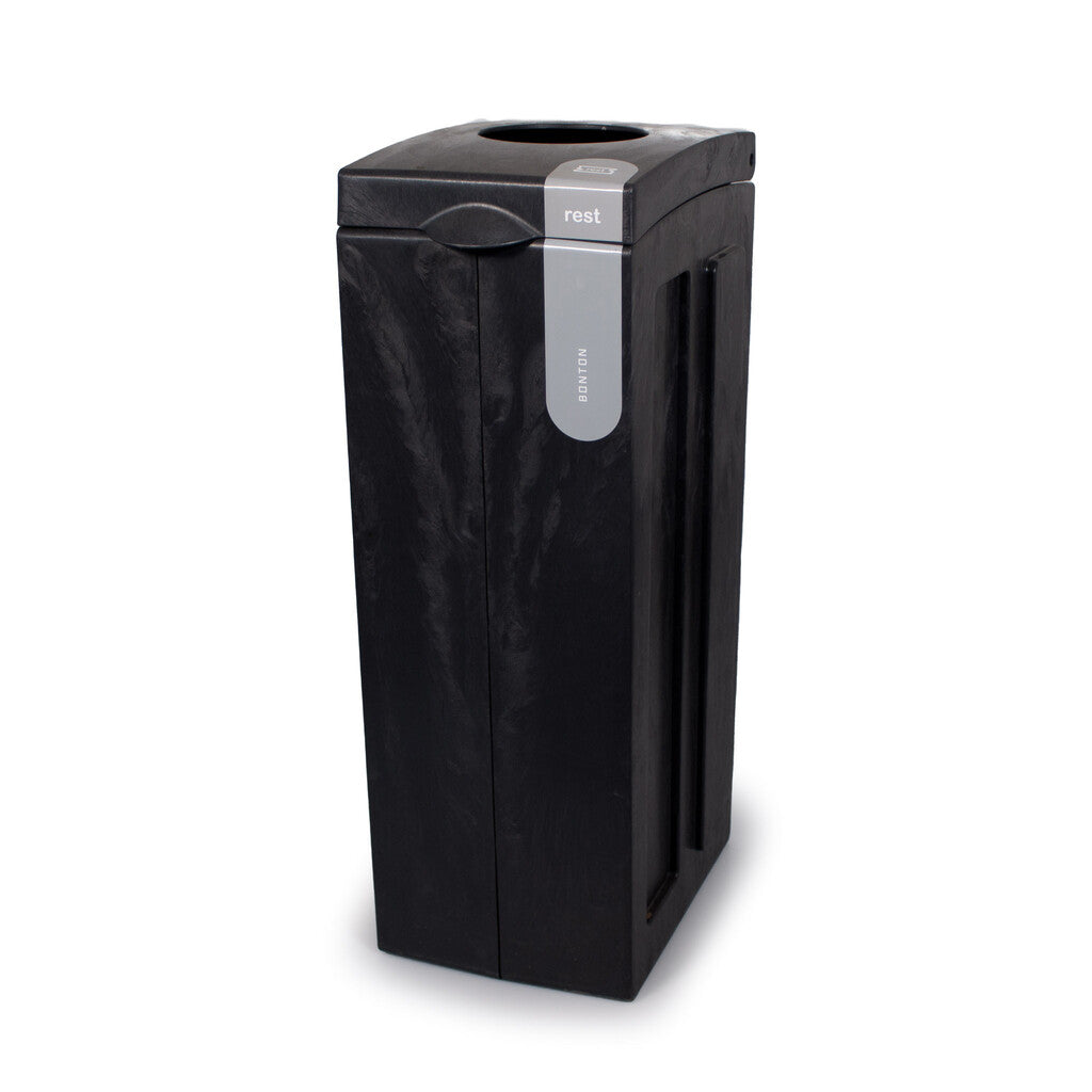 Circulaire afvalscheidingsmodule van 100% gerecycled polypropyleen uit bouw- en sloopafval en grofvuil. Doordat er bij de productie gebruik is gemaakt van gerecyclede kunststoffen heeft iedere unit een uniek uiterlijk. Modulair systeem, klik eenvoudig verschillende modules aan elkaar tot een complete afvalscheidingsunit. De module heeft een kunststof binnenemmer en is voorzien van een gekleurde sticker om de afvalstroom aan te duiden (Nederlandse tekst). De Bonton Original is tevens zonder bestickering leverbaar. Afwijkende stickers op aanvraag. Perfect passende afvalzakken om de Bonton schoon te houden zijn apart te bestellen.