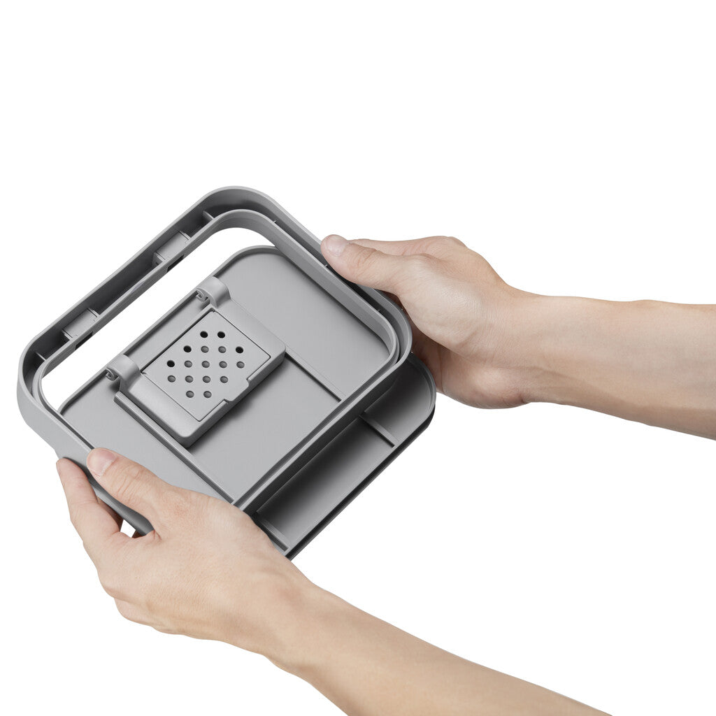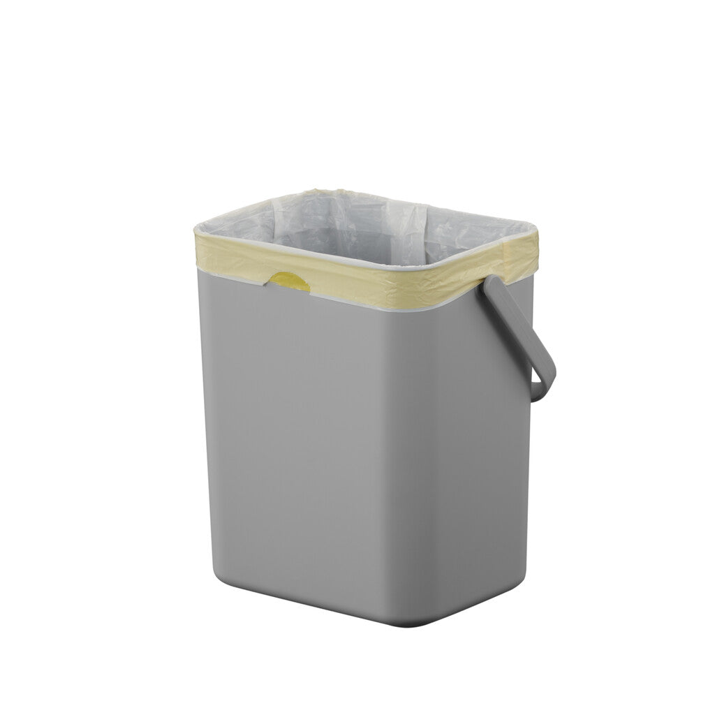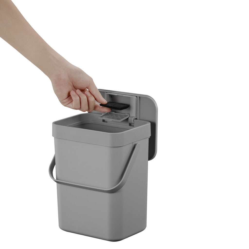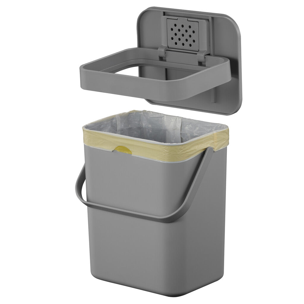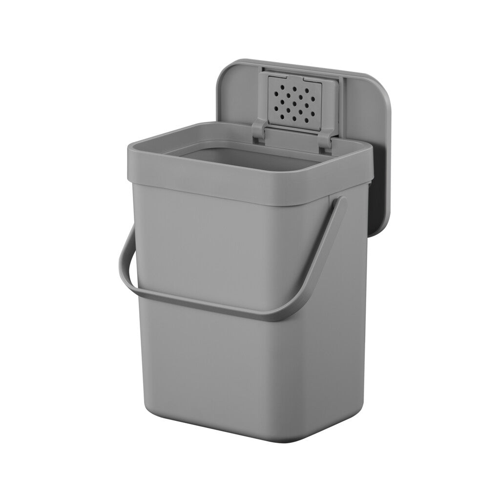 Compact afvalbakje van kunststof voor GFT-afval. Voorzien van handig hengsel om makkelijk te verplaatsen. De twee manieren om het deksel te openen verhoogt de efficiëntie in gebruik. Makkelijk op te hangen aan een keukenkastdeurtje, tevens te bevestigen aan een muur of flexibel te plaatsen op het aanrecht. Het bakje heeft een verwijderbaar frame om de compostzak op zijn plaats te houden en is daardoor makkelijk schoon te maken.
