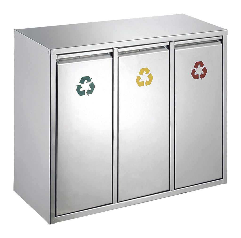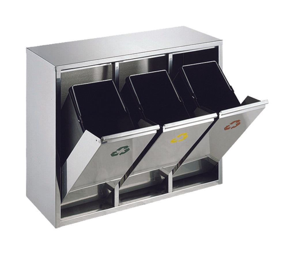 Recycling afvalbak van mat RVS voorzien van 3 kunststof binnenbakken (3x 8 ltr), die eenvoudig te legen zijn via de voorzijde van de afvalbak. Geschikt voor wandmontage.