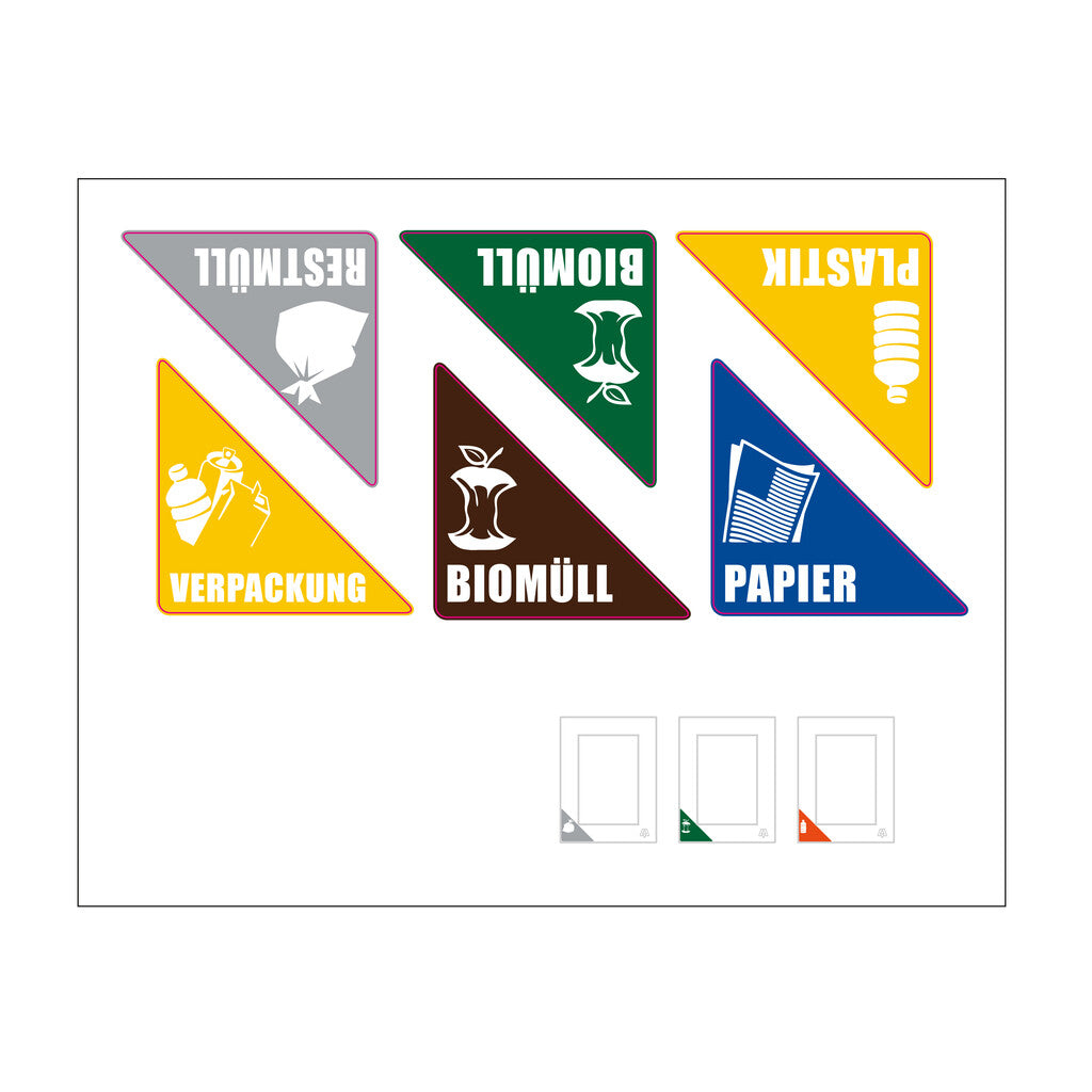 Stickers voor de RecycloFlex om de verschillende afvalstromen kenbaar te maken. Stickervel Duits: Restmüll, Verpackung, Papier, Bio.