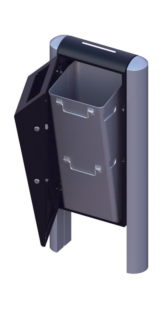 Fraai vormgegeven, robuuste buitenafvalbak van hoogwaardig, gepoedercoat verzinkt staal met inworpopening aan één zijde. Met een meegeleverde driekantsleutel is de afvalbak eenvoudig en snel te ontgrendelen. Door het openen van de deur is de robuuste, maar lichte aluminium binnenbak (50 liter) vrij toegankelijk en eenvoudig te ledigen. Duurzaam en vandalismebestendig. Zowel te bevestigen op een reeds aanwezige paal/ buisbeugel, als aan een hekwerk/ muur. Met de optioneel beschikbare aluminium profielstaanders creëert u een aantrekkelijk geheel.