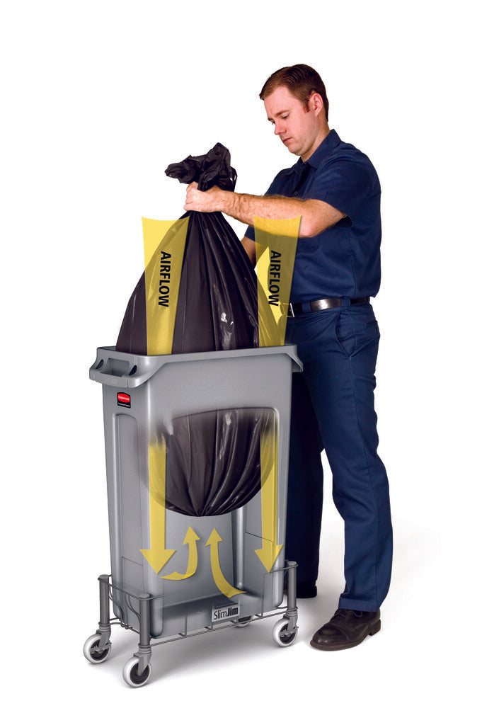 Kunststof Slim Jim container met luchtsleuven waardoor minder trekkracht nodig is om de afvalzak te verwijderen. Vier doortrekopeningen en treksluitingen maken vastbinden overbodig. Vaste gegoten grepen maken heffen en legen eenvoudiger.