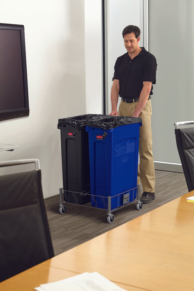 Kunststof Slim Jim container met luchtsleuven waardoor minder trekkracht nodig is om de afvalzak te verwijderen. Vier doortrekopeningen en treksluitingen maken vastbinden overbodig. Vaste gegoten grepen maken heffen en legen eenvoudiger.
