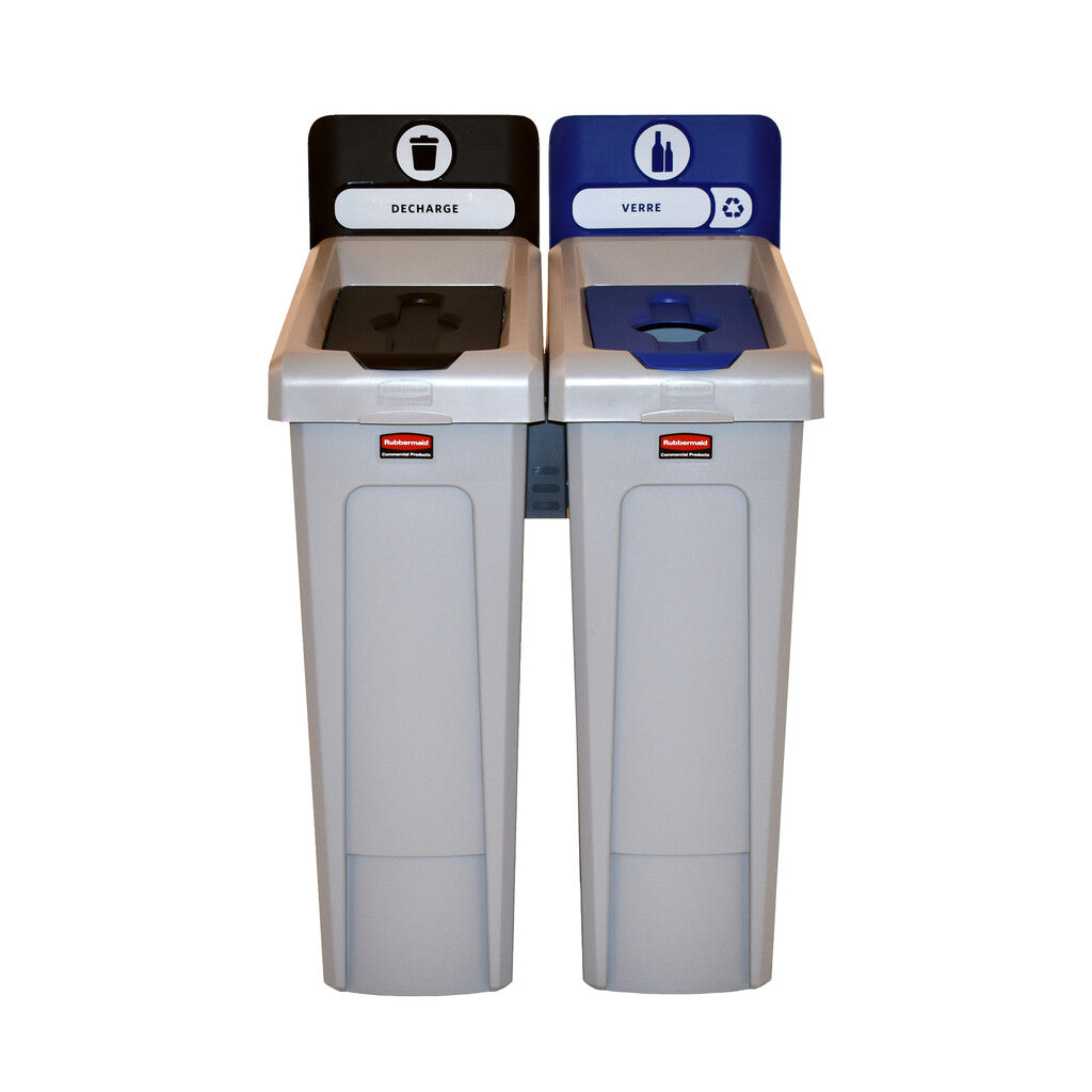 Compleet Slim Jim Recyclingstation voor twee afvalstromen. De set bestaat uit twee koppelbare Slim Jim containers waarvan een container voorzien is van een zwart gesloten deksel en een container met een blauw flessendeksel. De totale set wordt geleverd met bijpassende gekleurde communicatiepanelen en een Franstalige labelset.