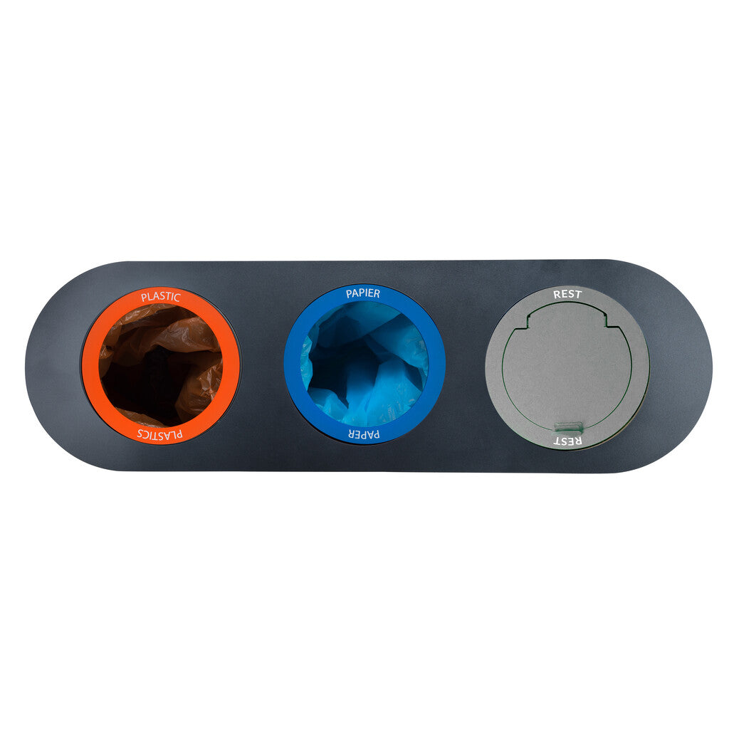 Tijdloze design afvalscheidingsunit van hoogwaardig gegalvaniseerd staal met gekleurde fractieringen in het deksel. Geschikt voor 3 afvalstromen (3x 38 liter), waarvan 2 met ronde inwerpopening (plastic, papier) en 1 (restafval) voorzien van een gesloten deksel. Deze ergonomische oplossing is verrijdbaar en heeft een snelwisselsysteem en uitneembare inserts waardoor het mogelijk is om de fracties per inzamelmiddel uit te wisselen of te variëren. Een ware blikvanger op kantoor, in een schoolgebouw of openbare ruimte.