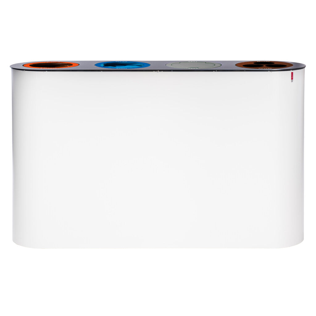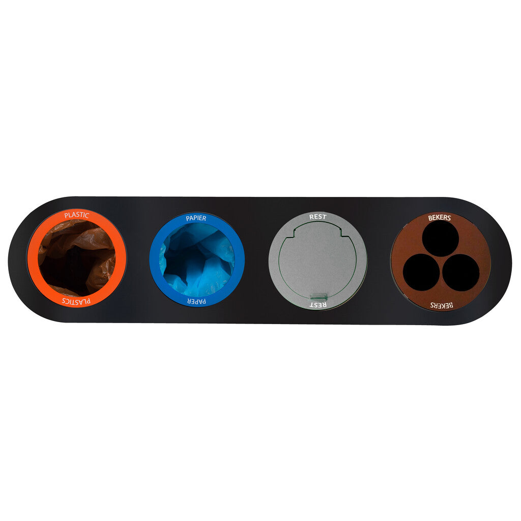 Tijdloze design afvalscheidingsunit van hoogwaardig gegalvaniseerd staal met gekleurde fractieringen in het deksel. Geschikt voor 4 afvalstromen (4x 38 liter), waarvan 2 met ronde inwerpopening (plastic, papier), 1 fractie (restafval) met gesloten deksel en 1 (bekers) voorzien van bekerbuizen. Deze ergonomische oplossing is verrijdbaar en heeft een snelwisselsysteem en uitneembare inserts waardoor het mogelijk is om de fracties per inzamelmiddel uit te wisselen of te variëren. Een ware blikvanger op kantoor, in een schoolgebouw of openbare ruimte.