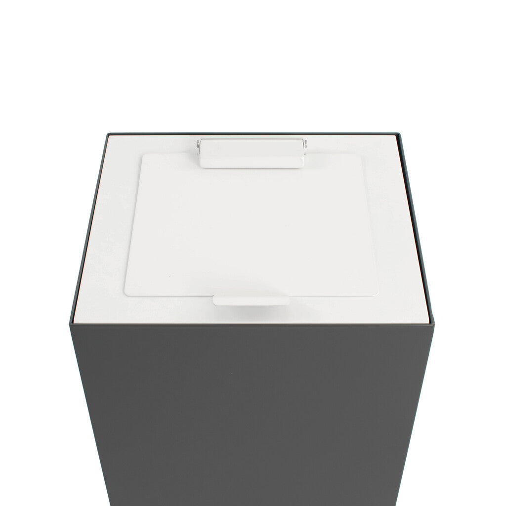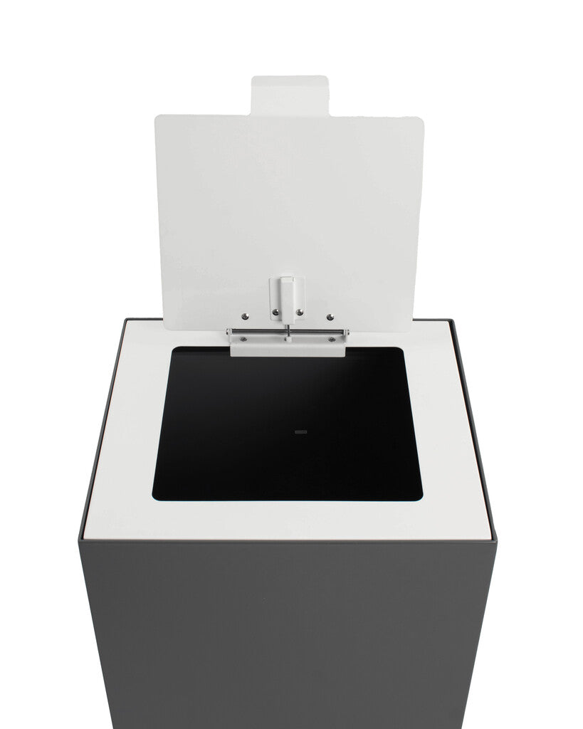 Degelijke top met klepdeksel van gepoedercoat staal om de modulaire afvalscheidingsunit 90L af te sluiten. Hierdoor wordt het afval uit het zicht onttrokken en nare geurtjes buiten de unit voorkomen. Het klepdeksel is voorzien van een dempingsysteem waardoor de klep geruisloos sluit. De top valt mooi in de unit waardoor een strak afvalscheidingsstation gecreëerd kan worden.
